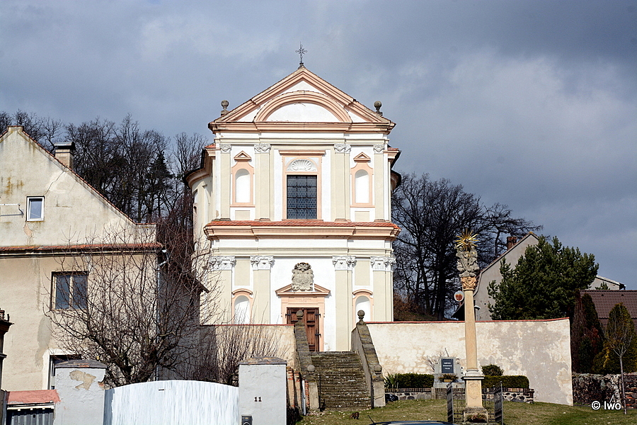 Zděná omítaná stavba na vysoké terase s předloženým schodištěm, na níž byl původně hřbitov. Půdorys v podobě řeckého kříže, s půlkruhově uzavřenými rameny. Průčelí člení lisenové rámy, pilastry a průběžné římsy. Střed předstupuje ve formě risalitu flankovaného svazkem pilastrů a ukončeného půlkruhovým tympanonenm. Za tím trojúhelníkový štít v šíři průčelí. Portál pravoúhlý s nápisem a lobkovickým znakem. V bočních křídlech plastiky v nikách. Boční stěny člení lisenové rámy. Okna ukončena segmentově. Vnitřek tvoří střední ovál členěný diagonálně dvojicí kompositních pilastrů. Mezi nimi niky s plastikami církevních otců. Zaklenuto valeně s lunetami. Presbytář 1 pole křížové a lunety. Jednotného založení z r. 1708, kvalitní hlavní oltář z doby kol r. 1710.