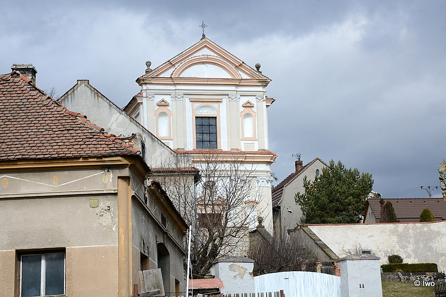 Zděná omítaná stavba na vysoké terase s předloženým schodištěm, na níž byl původně hřbitov. Půdorys v podobě řeckého kříže, s půlkruhově uzavřenými rameny. Průčelí člení lisenové rámy, pilastry a průběžné římsy. Střed předstupuje ve formě risalitu flankovaného svazkem pilastrů a ukončeného půlkruhovým tympanonenm. Za tím trojúhelníkový štít v šíři průčelí. Portál pravoúhlý s nápisem a lobkovickým znakem. V bočních křídlech plastiky v nikách. Boční stěny člení lisenové rámy. Okna ukončena segmentově. Vnitřek tvoří střední ovál členěný diagonálně dvojicí kompositních pilastrů. Mezi nimi niky s plastikami církevních otců. Zaklenuto valeně s lunetami. Presbytář 1 pole křížové a lunety. Jednotného založení z r. 1708, kvalitní hlavní oltář z doby kol r. 1710.