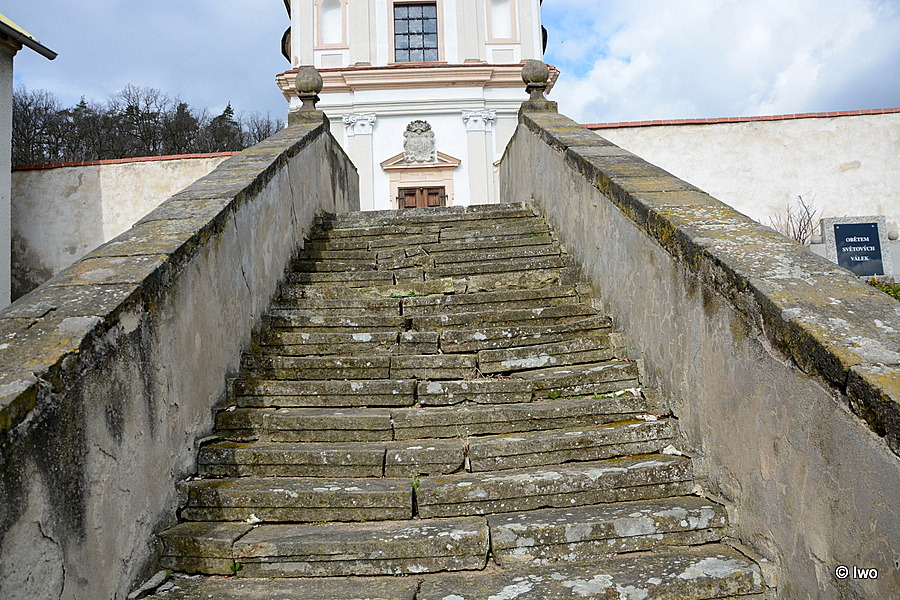 Přímé schodiště se nachází v ose hlavního vstupu do kostela sv. Vavřince v jeho jihozápadním průčelí. Lemují ho omítnuté zdi, které mají korunu zdiva krytou příčně kladenými kamennými deskami. U dolního a horního stupně schodiště se na zdi nachází velký kulovitý čuček na soklu. Ten má dole širší základnu, na níž navazuje směrem vzhůru se konkávně zužující podstavec. Nahoře je zakončený zaoblenou přesahující římsou. Zeď nahoře pokračuje ještě rovným úsekem, na který se kolmo napojuje ohradní zeď. V dolní části je do zdi osazená železná dvoukřídlá branka, zdobená v dolní části kruhy a ve středním a horním úseku stáčenými motivy. Svislé pruty jsou střídavě vyšší a nižší, ukončené koulí. Nad vyššími pruty je koule menší, posazená na vysokém členitém soklu, nad nižšími pruty je sokl drobný a koule mohutnější.