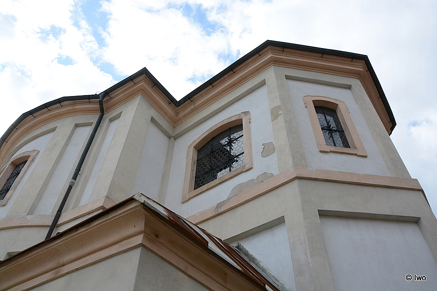 Jihovýchodní průčelí tvoří loď a presbytář. Obě části člení lizénové rámy ve dvou úrovních, oddělených plochou římsou – ta probíhá ve stejné úrovni jako profilovaná římsa pod oknem jihozápadní fasády. U jižního nároží lodi je stejný pilastr jako na jihozápadě. V levé ose se nachází zazděný vstupní portál s uchy s kapkou, nad ním je menší obdélné, na šířku orientované okno ve špaletě, rozdělené vodorovnou a svislou příčlí. Lemuje ho šambrána s uchy s kapkou a rozšířenými dolními rohy. V horní partii fasády je větší okno, nahoře zakončené do mírného segmentového oblouku. Umístěné je ve špaletě a zasklené šestiúhelníkovými tabulkami, zasazenými do olova. Rozdělené je svislou a vodorovnou železnou příčlí, doplněnou v křížení ozdobným motivem. Kolem okna je podobná šambrána jako u dolního. Směrem doprava následuje vypouklá část lodi, která je dole bez otvorů. V horní etáži je sdružené okno, tvořené dvěma díly s šestiúhelníkovými tabulkami v olovu. Každý díl zpevňují dvě vodorovné a jedna svislá železná příčle, v obou kříženích se stejným motivem jako v levé ose. Oba díly jsou nahoře zakřivené tak, že spolu vytvářejí segmentový oblouk. Okno má podobnou šambránu jako levá osa. Na vypouklou část lodi navazuje rovný úsek bez otvorů, který je však podstatně užší než úsek na levé straně. Loď má profilovanou hlavní římsu, pokračující i na presbytář. Ten je stejně vysoký jako loď, ale užší. V jeho jihovýchodní stěně je v horní partii podobné okno jako v levé ose lodi, avšak širší. Rozdělují ho dvě vodorovné a dvě svislé železné příčle, opět s ozdobou v kříženích. Obdobná je i šambrána. Dolní úroveň presbytáře z velké části zakrývá obdélná sakristie. Její stěny člení lizénový rám. Na jihovýchodní straně jsou dva otvory vedle sebe. Vlevo je zazděný vstup v šambráně s rozšířenými horními rohy, vpravo okno, zabezpečené vnější mříží. Má šambránu s uchy s kapkou a dolními rohy dole rozšířenými. Obdobnou šambránu má i okno v severovýchodní stěně, které je však orientované na šířku a rozdělené do kříže. Stěny sakristie zakončuje profilovaná hlavní římsa, valbovou střechu kryjí plechové šablony. Také závěr člení lizénové rámy. Jeho střední stěna je rovná a boční šikmé. Dolní úroveň je bez otvorů, v horní je v každé stěně podobné okno jako v levé horní ose jihovýchodního průčelí lodi, avšak o něco užší. Severozápadní strana kostela je obdobou svého protějšku. Loď i presbytář mají sedlovou střechu, závěr půljehlancovou, krytinou jsou plechové šablony.