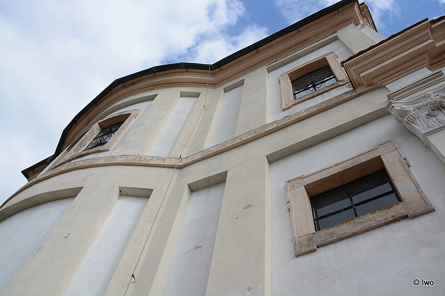Jednolodní kostel je zděná omítnutá budova, jejíž obdélná loď je ve středu jihovýchodní a severozápadní strany oble rozšířena. Stejně vysoký, avšak užší obdélný presbytář má trojstranný závěr se střední stěnou situovanou rovně a bočními na koso. K jihovýchodní a severozápadní stěně presbytáře je připojena obdélná sakristie. Jihozápadní průčelí lodi má bohaté architektonické členění, jeho střední část se nachází v mírném rizalitu. Dolní část stěny chrání sokl, který pokračuje i na další strany objektu. V ose rizalitu je umístěn vstup, před nímž je kamenná teráska, přístupná po dvou kamenných schodech. Dvoukřídlé dřevěné dveře rámové konstrukce jsou osazené v líci, kovové panty i klika se štítkem na pravém křídla mají zdobné provedení. Obě křídla člení tři obdélné výplně nad sebou, střední je vyšší. Kolem dveří je portál se zvýrazněnou patkou a s uchy s kapkou, nad dveřmi je rozeklaný profilovaný trojúhelný fronton. Do prostoru mezi jeho boky zasahuje velký alianční erb s lobkovickým a ditrichštejnským erbem, umístěný na stěně nad vstupem. Fronton nesou dva krátké pilastry bez patky, vyrůstající nad uchy portálu, mezi nimi je vyrytý nápis s letopočtem „ANNO DOMINI / 1.7.0.8“. U obou nároží středního rizalitu je sdružený pilastr s kompozitní hlavicí, stejně je tomu tak i u nároží lodi. Ve stěně mezi rizalitem a nárožími je vyhloubena dosti vysoká nika, zaklenutá konchou a lemovaná šambránou s uchy. Nahoře je šambrána rozšířená do bohaté profilace a doplněná římsou tvaru segmentového oblouku. Niky jsou dnes prázdné. Nad nimi a pod nimi je vpadlé pole – dole čtvercové, nahoře obdélné. Pilastry nesou profilovaný architráv a prosté kladí, nad nímž se zvedá bohatě profilovaná římsa. Ta odděluje horní část průčelí obdobného členění jako dolní partie. Zdejší pilastry však mají jónskou hlavici s rouškou zavěšenou za závity, u nároží je pilastr pouze jednoduchý. Niky mají nahoře orámování vyvýšené a na něm je usazen uzavřený trojúhelný fronton. Horní vpadlé pole chybí a dolní je obdélné, orientované na šířku. V ose rizalitu se nachází velké obdélné okno ve špaletě, rozdělené třemi vodorovnými a dvěma svislými kovovými příčlemi. Zasklené je šestiúhelníkovými tabulkami, zasazenými do olova. Po stranách okna se nachází šambrána, vyvýšená až pod profilovanou nadokenní římsu. Nahoře má ucha s kapkou, v poli mezi římsou a oknem je nízká a široká půlkruhová nika s reliéfem mušle. Pilastry nesou profilovaný architráv a prosté kladí. Průčelí završuje trojúhelný štít s bohatě profilovaným orámováním, v němž je nad středním pilastrem ještě segmentový fronton. Po obou stranách štítu se nachází kulovitý čuček, v jeho vrcholu je zasazený obrysový kříž s kruhovitě rozšířenými konci břeven, doplněný v křížení břeven vždy jedním zvlněným paprskem.
