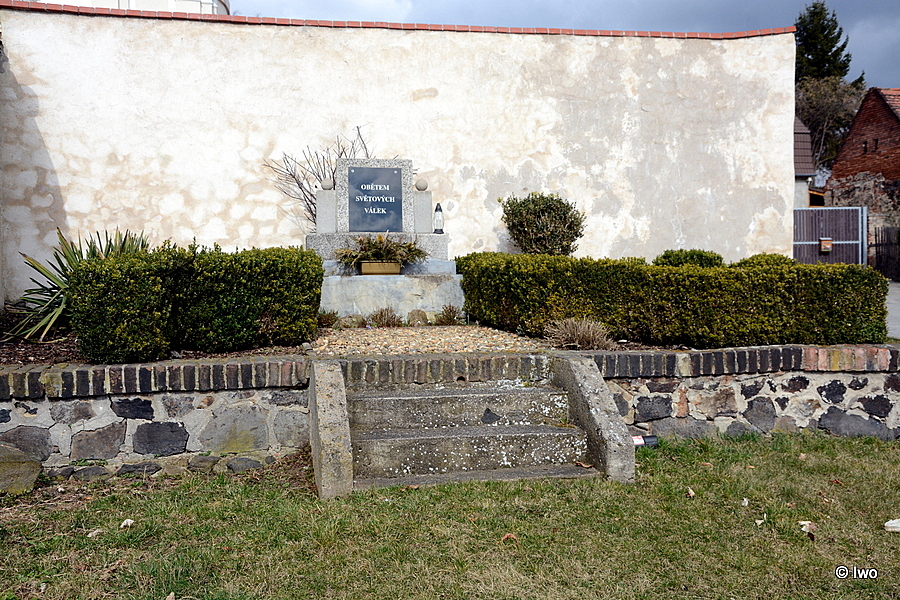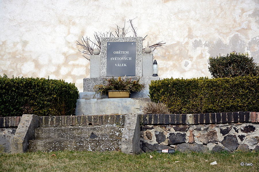 Vzpomínkové místo (6×5 m) s pomníkem je umístěno na vyvýšeném místě na návsi u kostela. Dvoustupňový betonový podstavec, na němž je umístěna ve vodorovné poloze základna ze 3 částí – kvádrů (kvádr 62x25x20 cm + 2 krajní kvádry 34x25x22 cm) , na níž je žulový hranol, po obou stranách hranolu jsou žulové kvádry (34x25x22 cm), na válcích žulové koule o průměru 11 cm. Původní pomník absolutně zničen, opraven na jaře 2013 z rozpočtu obce ve výši 48 000 Kč.
