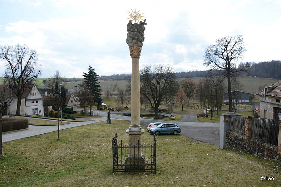 Neznámý autor, sloup se sousoším Nejsvětější Trojice (Triumfální) v obci před kostelem, 1. desetiletí 18. století, sousoší 2. polovina 19. století, schodiště a sousoší pískovec jemnozrnný, podstavec a dřík opuka, po restaurátorském zásahu římsa a patka sloupu kopie u pískovce, hlavice sloup výdusek.