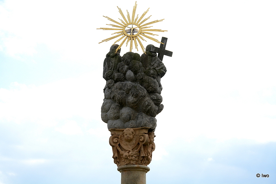 Dvojitý hranolový sokl má na čelní straně erb Lobkoviců. Na něm stojí pískovcový sloup s kompozitní hlavicí, nesoucí sedící sochy Krista a Boha Otce. Doplňuje je Duch svatý v podobě holubice se svatozáří. Sloup pochází z 1. čtvrtiny 18. století.