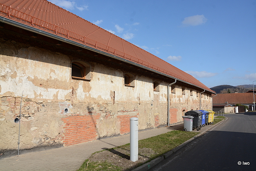Vedle zámku se nachází hospodářský objekt. Je to patrová, zděná a omítnutá budova, postavená na protáhlém obdélném půdorysu. Jihozápadní průčelí má v přízemí omítku poškozenou, takže je patrné zdivo z lomového kamene. V menší míře, zejména u otvorů, je doplněné cihlami, nároží zpevňují kvádry. Patro je jedenáctiosé, v přízemí je otvorů méně. V jeho pravé části jsou čtyři nízké obdélné, na šířku orientované okenní otvory. Zabezpečené jsou ozdobnou mříží ze zprohýbaných prutů, spojených prstenci a dnes vyplněné skleněnými cihlami. Otvory v ose první a třetí zprava mají kamenné ostění, dva zbývající lemovala šambrána. V ose páté zprava byl podobný otvor, avšak širší, dnes je zazděný. Několik zazděných otvorů se nachází také ve zbývající části přízemí. V patře jsou ve všech osách na šířku orientovaná okna, nahoře zakončená do velmi mírného segmentového oblouku. Dnes jsou převážně vyplněná skleněnými cihlami. V ose deváté zprava je okno menší, okolo je patrná zazdívka. Jihovýchodní průčelí má ve středu přízemí menší obdélné okno, vyplněné skleněnými cihlami a zabezpečené vnější mříží. Nahoře a po stranách má kamenné ostění. Nad prvním patrem, které je bez otvorů, se zvedá trojúhelný štít. Protější severozápadní fasáda je bez otvorů, na pravé straně je k ní připojena nově vystavěná brána. Severovýchodní průčelí má v patře jedenáct stejných oken jako na jihozápadě, většina z nich je vyplněna skleněnými cihlami. V přízemí jsou v jednotlivých osách dveřní otvory různé velikosti, některé z nich jsou dnes zazděné. Sedlovou střechu kryjí bobrovky.