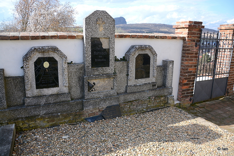 U západní ohradní zdi hřbitova v Hrobčicích se nachází kenotaf Alfeda Harnische.