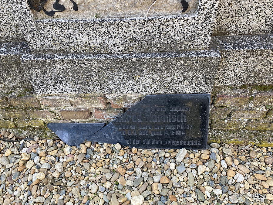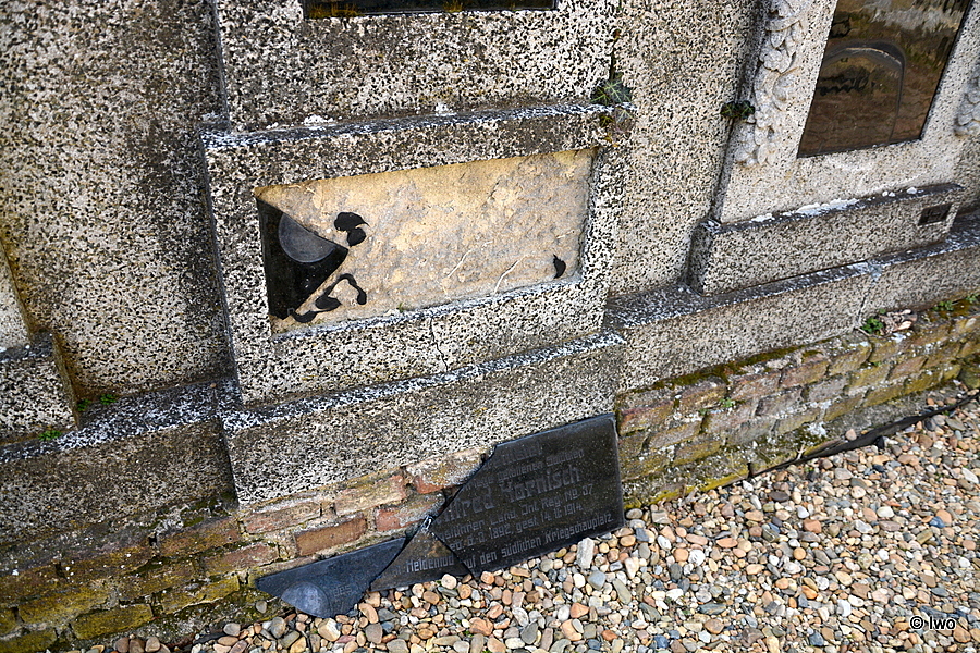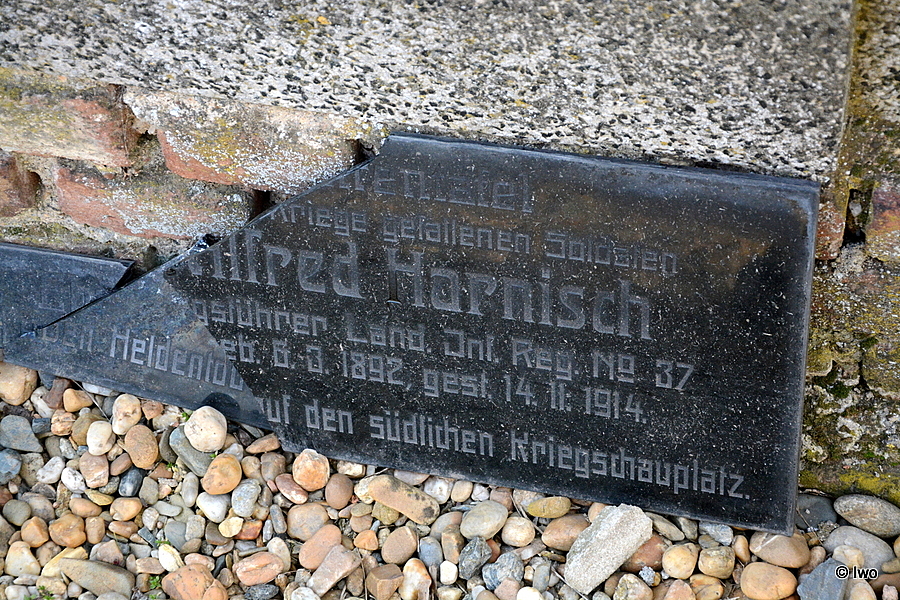 U západní ohradní zdi hřbitova v Hrobčicích se nachází kenotaf Alfeda Harnische.
