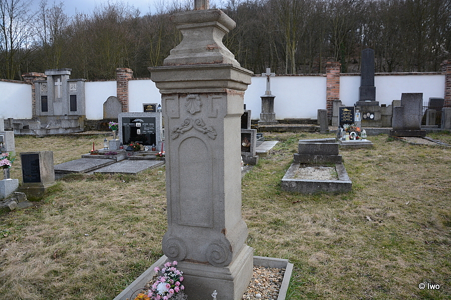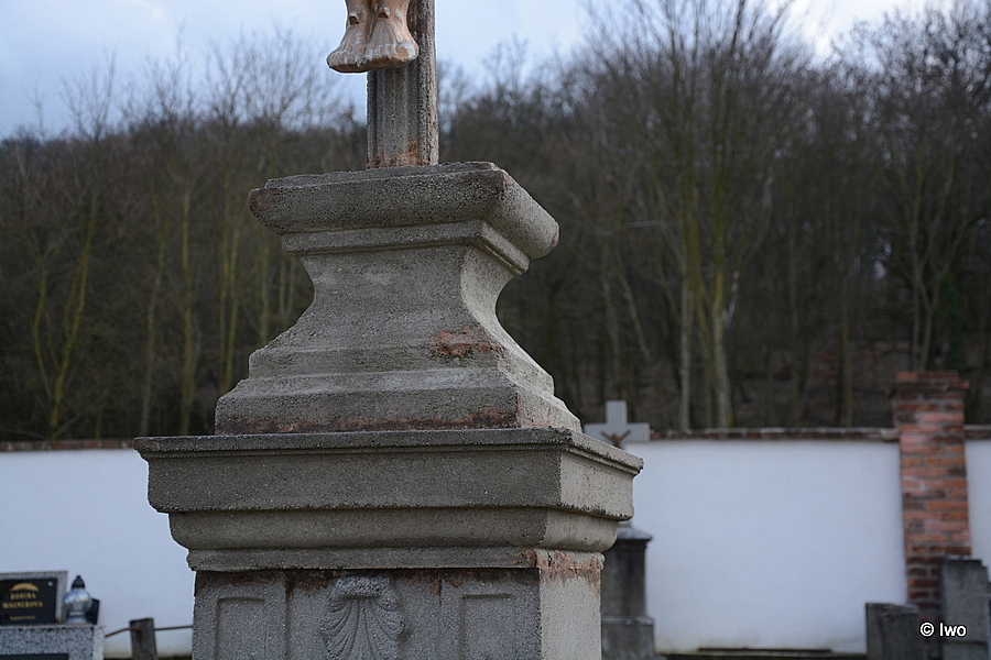 V mírném svahu vede kačírkem vysypaná cesta od severní ohradní zdi do zhruba půli délky hřbitova. Na konci cesty vysokým obrubníkem ohraničený prostor, opět vysypaný kačírkem. V něm stojí stupňovitý sokl. Spodní širší kvádr s hladkými stěnami přechází dvojitou lištou do vlastního těla. To má na spodní části voluty. Na čele dříku lemovaného po stranách tenkou lisénou, vycházející z voluty, vysoké rámované pole s horním obloukem, bez nápisu. Nad ním rostlinný ornament a mušle, visící z hlavice. Přesahující římsová hlavice na rovné horní ploše nese několikastupňový projmutý sokl, v němž je vsazen masivní kovový kříž. Konce břeven tvarovány do trojlístku, povrch trámů zvýrazněn rýhovaním. Nad hlavou ukřižovaného Krista chybí INRI.