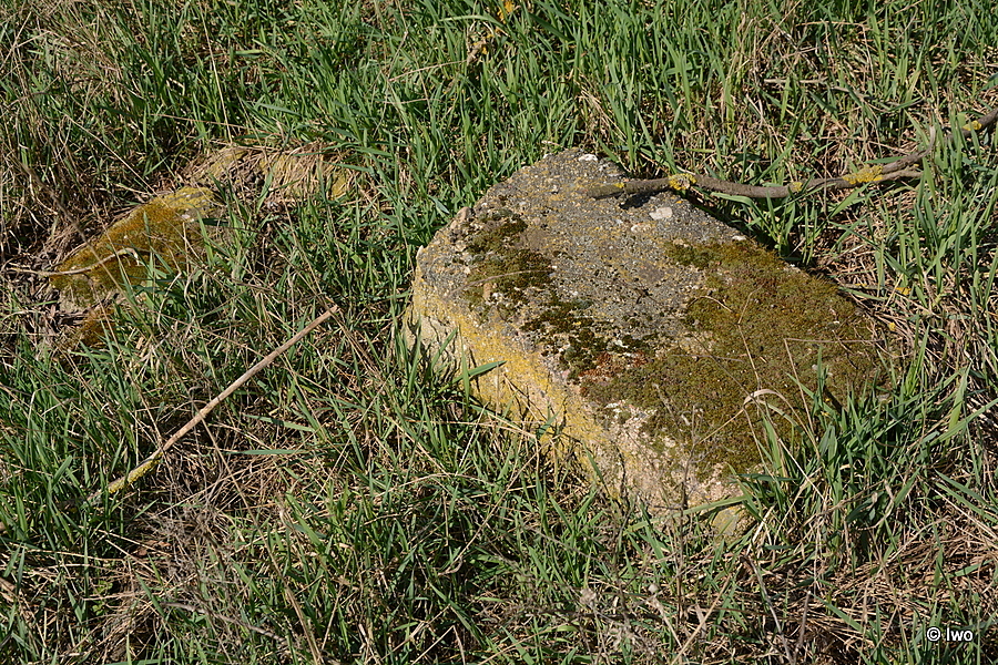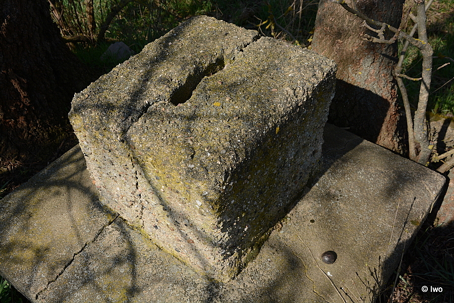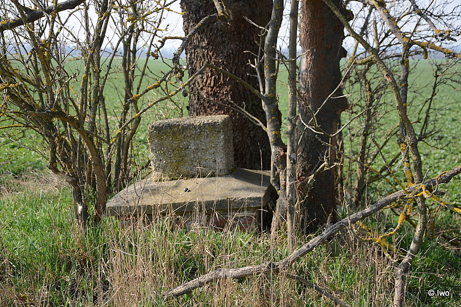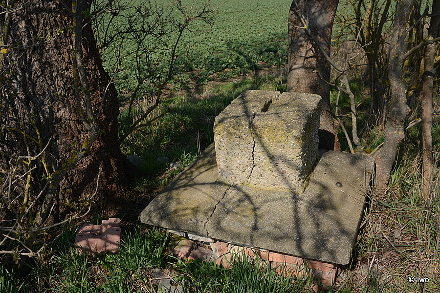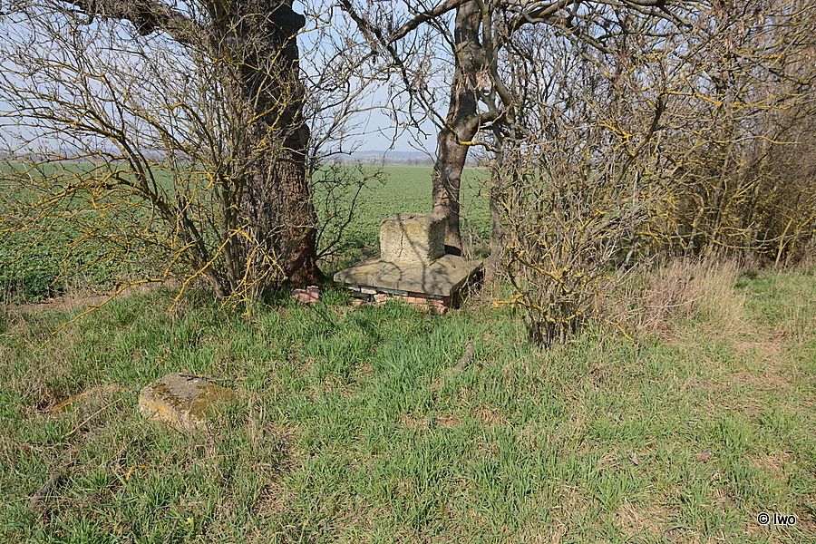 Pár bloků pohozeno o kus vedle, přímo u stromu několik neúplných řad rozpadajících se cihel a na nich zřejmě pozůstatek hlavice se soklem kříže. Příčně skrz naskrz prasklé, na horní skloněné ploše hlavice na jedné straně kovový výstupek. V horní části soklíku spára po chybějícím kříži.