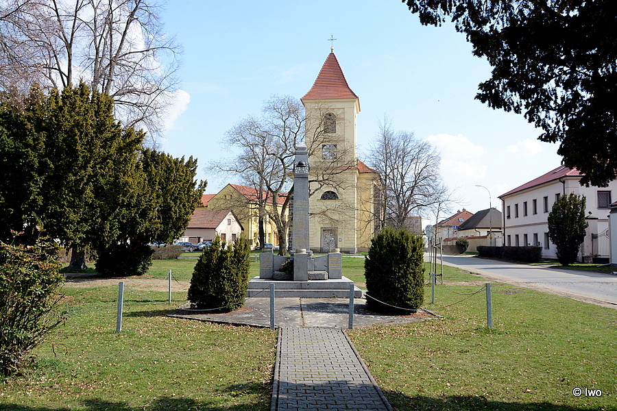 Pomník pro oběti 1. a 2. SV na návsi obce. Pomník je hmotově složitější. Na dvoustupňovém podstavci stojí seskupení čtyř nižších, na výšku posazených, hranolů, nahoře zakončených kruhovou žulovou miskou. Tyto hranoly obklopují vysoký štíhlý obelisk, nahoře zakončený jehlancovitě.