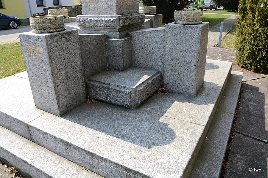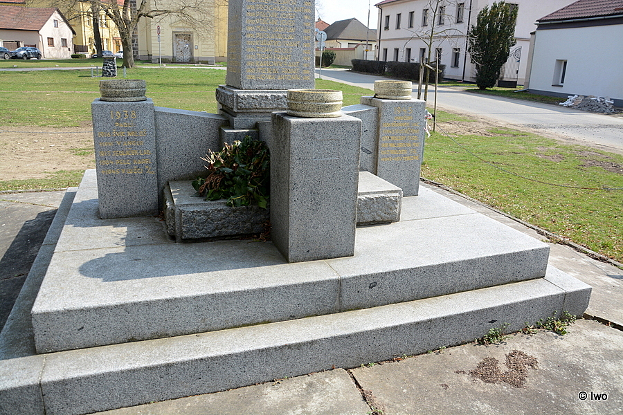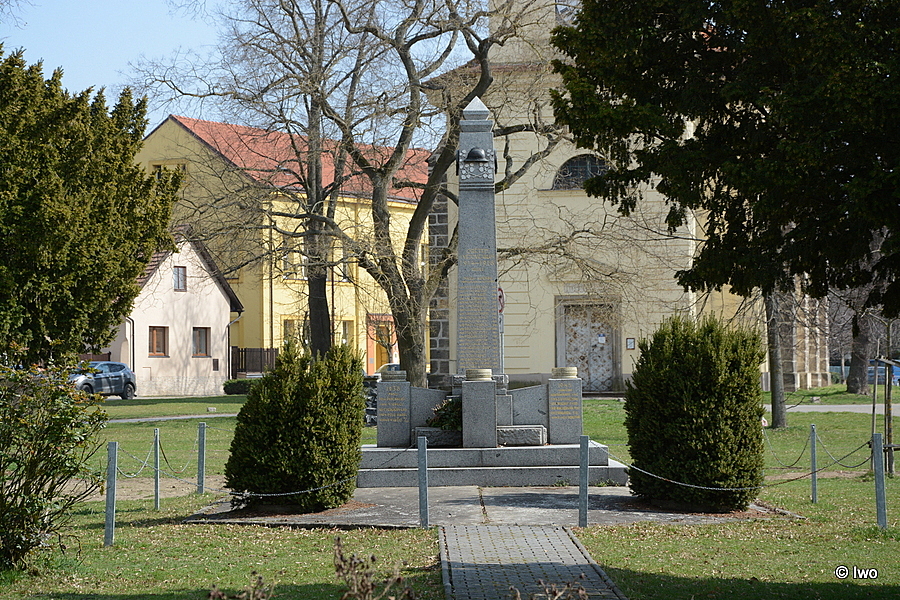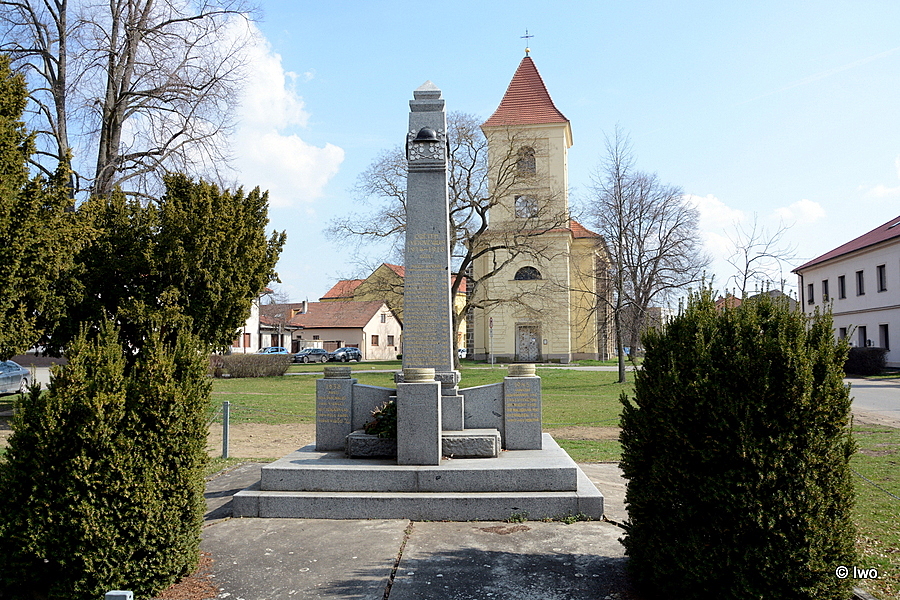 Pomník pro oběti 1. a 2. SV na návsi obce. Pomník je hmotově složitější. Na dvoustupňovém podstavci stojí seskupení čtyř nižších, na výšku posazených, hranolů, nahoře zakončených kruhovou žulovou miskou. Tyto hranoly obklopují vysoký štíhlý obelisk, nahoře zakončený jehlancovitě.