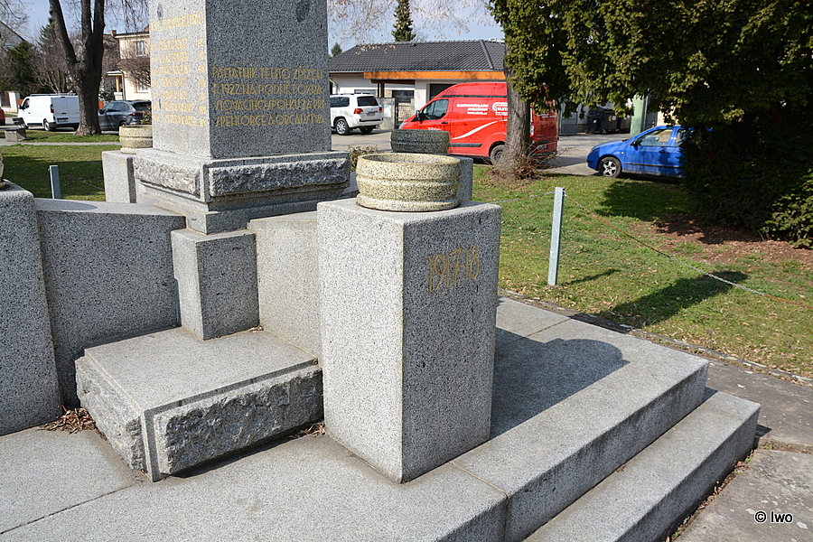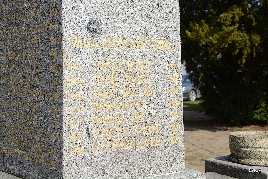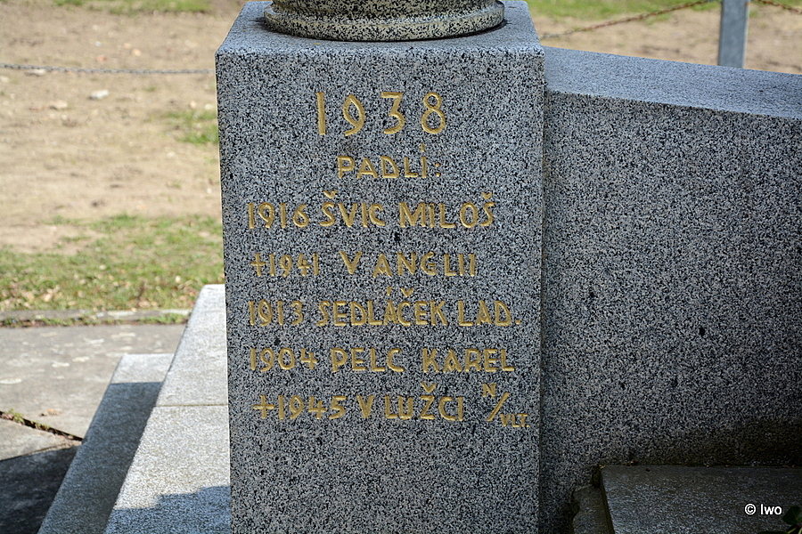 Na jednom z nižších hranolů je psáno: 1938 padlí, 1916 Švic Miloš, zemř. 1941 v Anglii, 1913 Sedláček Lad., 1904 Pelc Karel zemř. 1945 v Lužci n/Vlt.