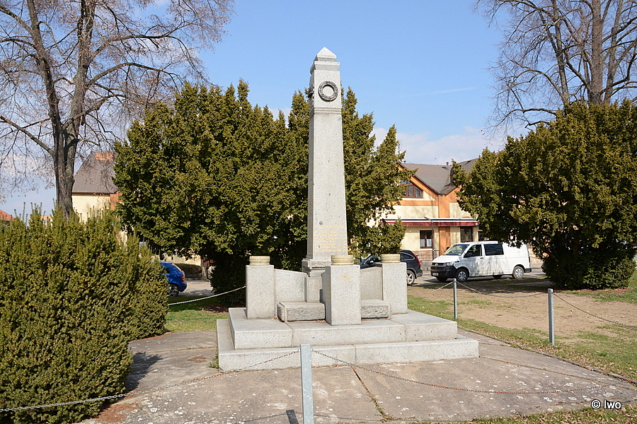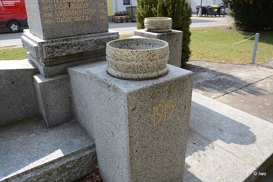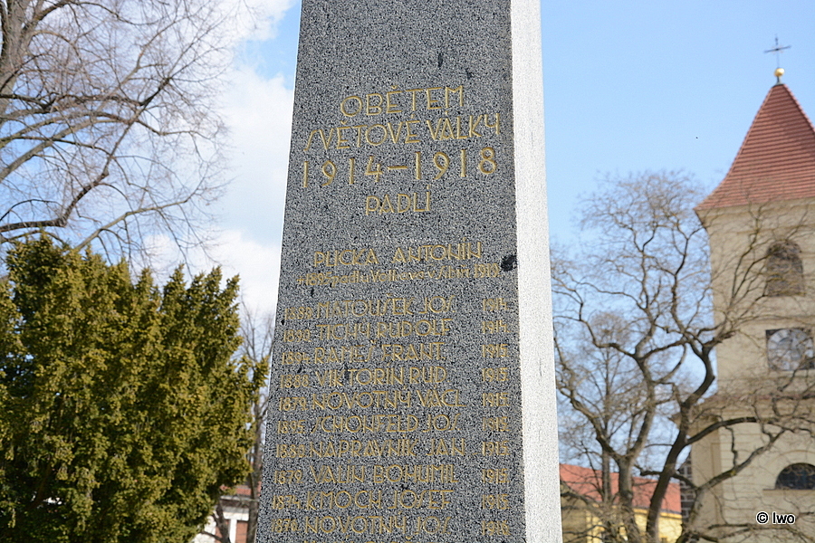 Na hlavním obelisku je napsáno: Obětem světové války 1914-1919 padlí, Plicka Antonín 1895 padl u Volkova 1919, 1889 Matoušek Jos. 1914, 1900 Tichý Rudolf 1914, 1894 Rameš Frant. 1915, 1888 Viktorín 1915, 1879 Novotný Vác.1915, 1895 Schönfeld Jos.1915, 1880 Nápravník Jan 1915, 1879 Valín Bohumil 1915, 1874 Kmoch Josef 1915, 1876 Novotný Jos. 1916, 1892 Malý Oldřich 1916, 1895 Procházka Ant. 1916, 1868 Ptáčník Josef 1916, 1892 Ptáčník Josef 1916, 1893 Malý Ladislav 1917, 1891 Plicka Václav 1917, 1892 Kuřátko Frnt. 1917, 1884 Tichý Adolf 1917, 1890 Tichý Frant. 1917, 1895 Karlovský Ant. 1917, 1883 Smejkal Frant. 1918, 1888 Novák Antonín 1915.