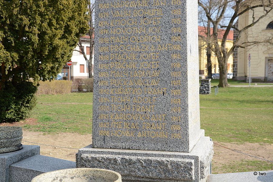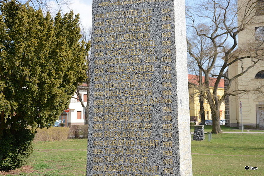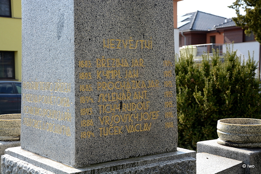 Na další straně obelisku: Nezvěstní 1883 Březina Jar. 1914, 1893 Kympl Jan 1915, 1885 Procházka Jar. 1915, 1894 Sklenář Ant. 1915, 1893 Tichý Rudolf 1915, 1886 Vršovský Josef 1916, 1894 Tuček Václav 1918.