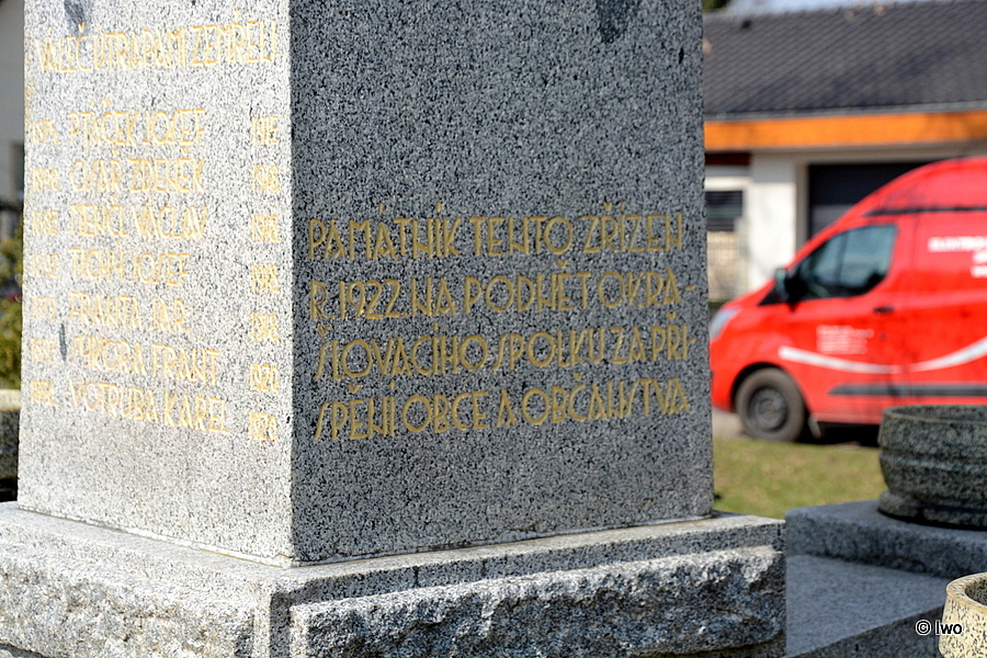 Památník tento zřízen r. 1922 na podnět okrašlovacího spolku za přispění obce a občanstva; Obětem světové války 1914-1919
