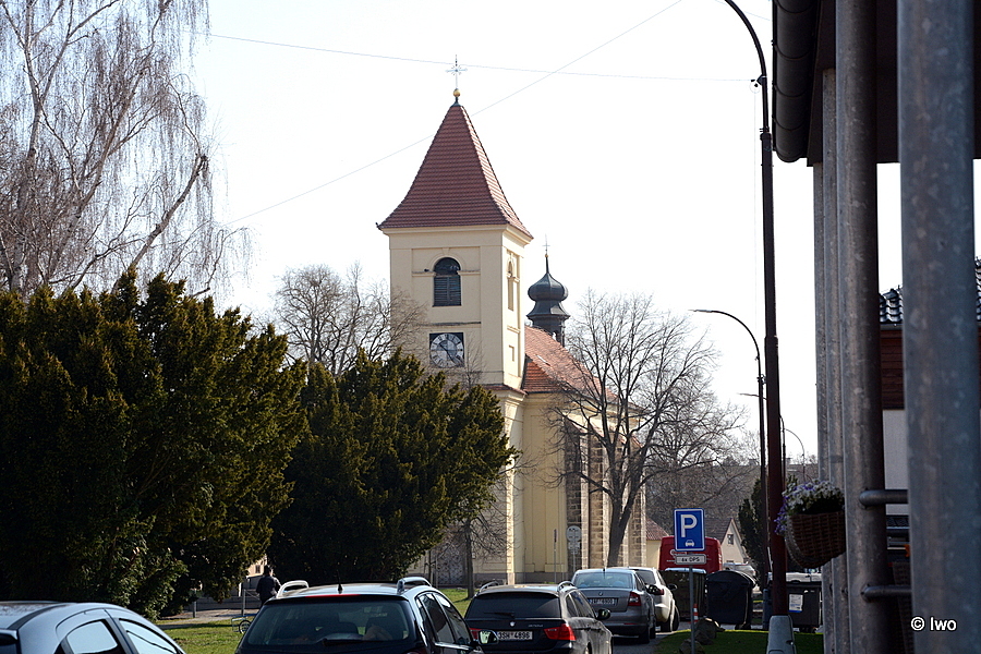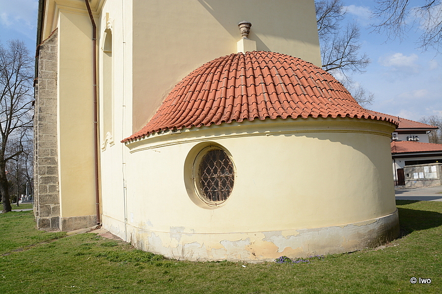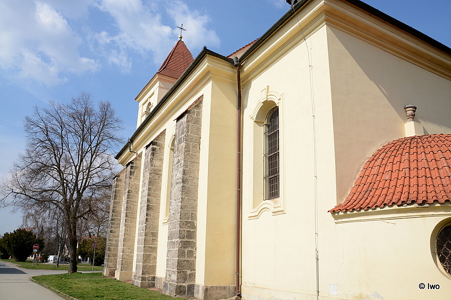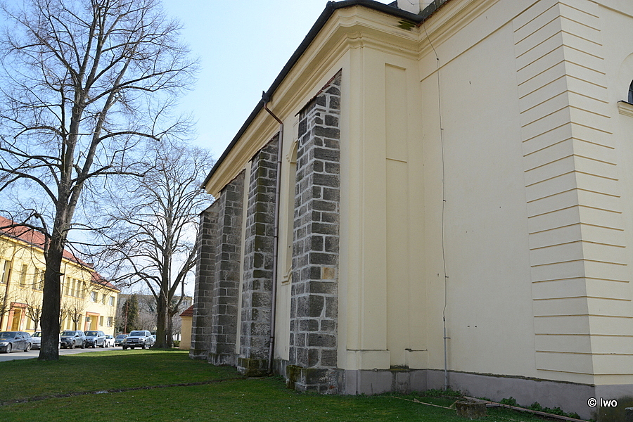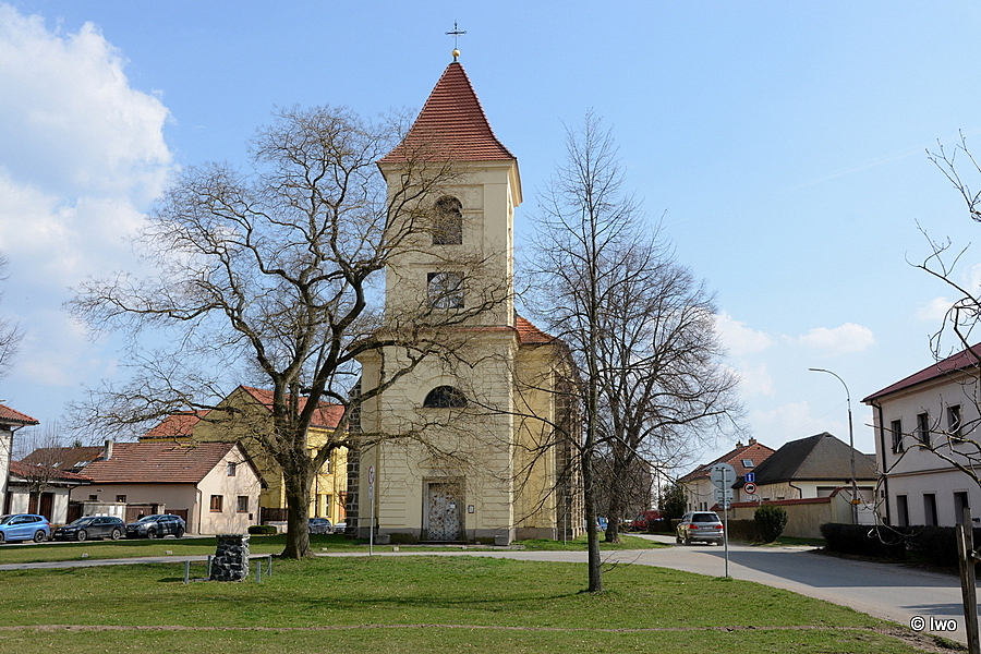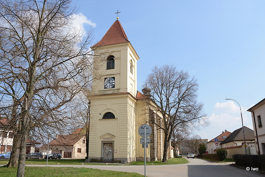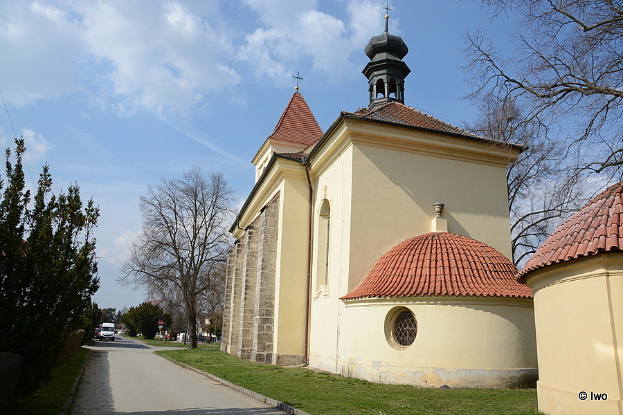 Jednolodní orientovaný rokokový kostel se čtvercovým presbytářem, půlkruhovou sakristií, hranolovou věží v Z průčelí a půlkruhovou sakristií v ose pravoúhlého presbytáře. Východně od kostela v prodloužené ose stojí okrouhlá centrální stavba márnice s třemi kaplovými rizality. Barokní kostel z roku 1762.