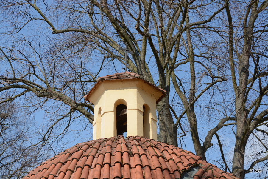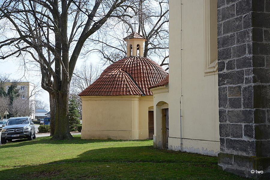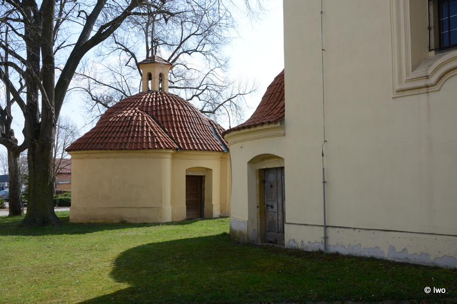 Za kostelem kaplička se zvonicí. Centrální stavba. V bočních stěnách prolomena oválná okna. Střecha prejzová, na špici je věžička s lucernou.