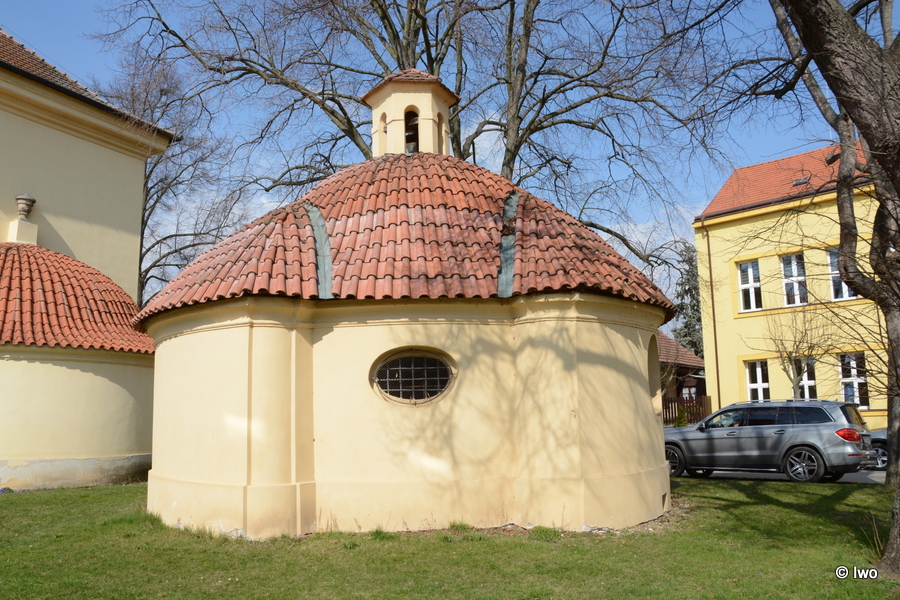 Okrouhlá centrální stavba s třemi zaoblenými kaplovými rizality s ústupky. Stavěno z pískovce a cihel. Střecha kupolovitá, krytá prejzy. Nad ní se zvedá šestiboká zděná zvonička s úzkými obloukovými otvory a se stříškou stanovou. Vstup od Z dveřmi s ostěním, vsazenými do segmentového výklenku. Okna oválná. Sklenuto kupolí.