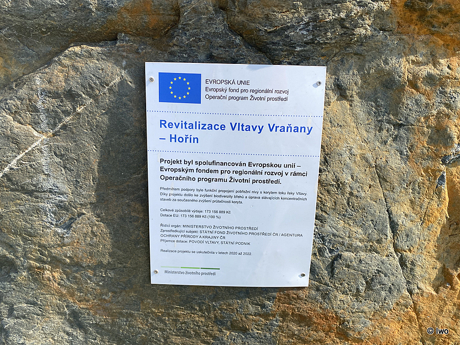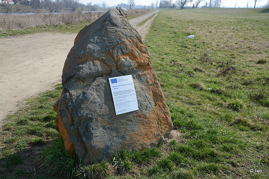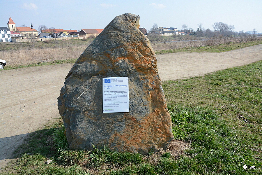 Na břehu Vltavy poblíž lávky z Lužce nad Vltavou stojí kámen s pamětní tabulí revitalizace Vltavy Vraňany – Hořín.