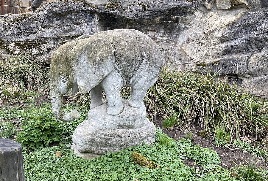 Jihozápadně od ostrova lemurů v ZOO Dresden u cesty kolem výběhu afrických slonů stojí kamenná plastika slona.