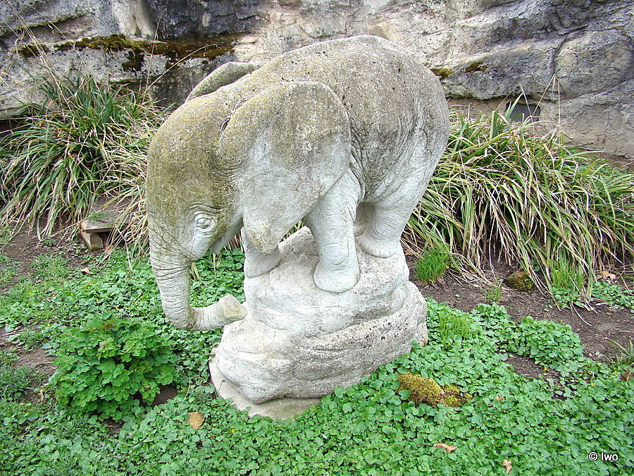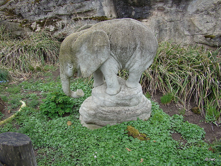 Jihozápadně od ostrova lemurů v ZOO Dresden u cesty kolem výběhu afrických slonů stojí kamenná plastika slona.