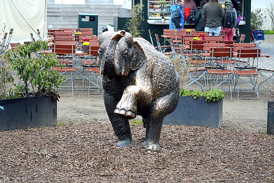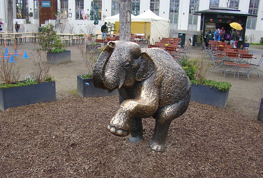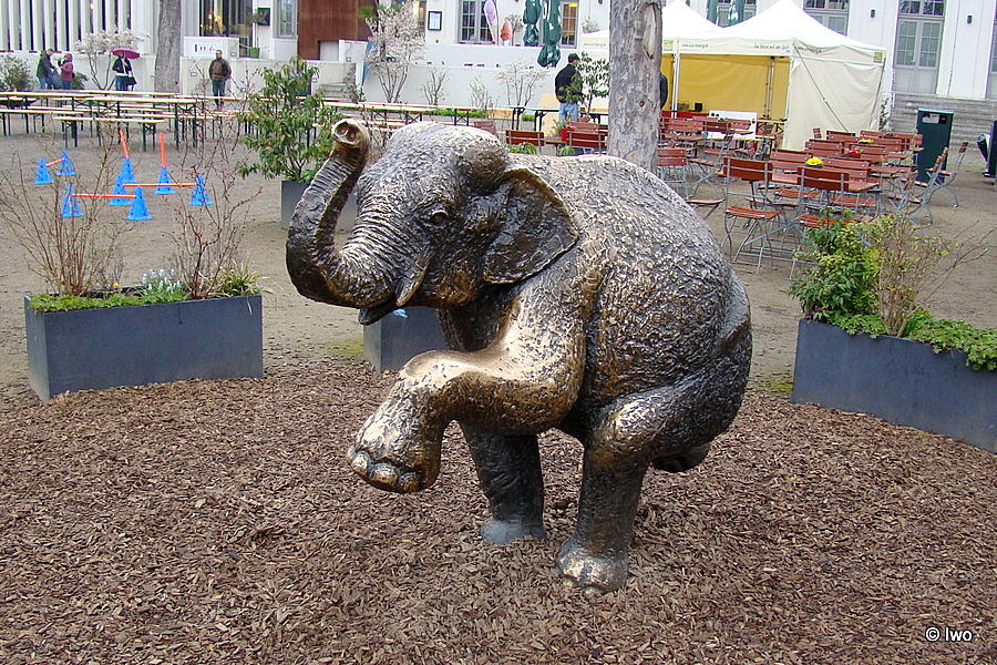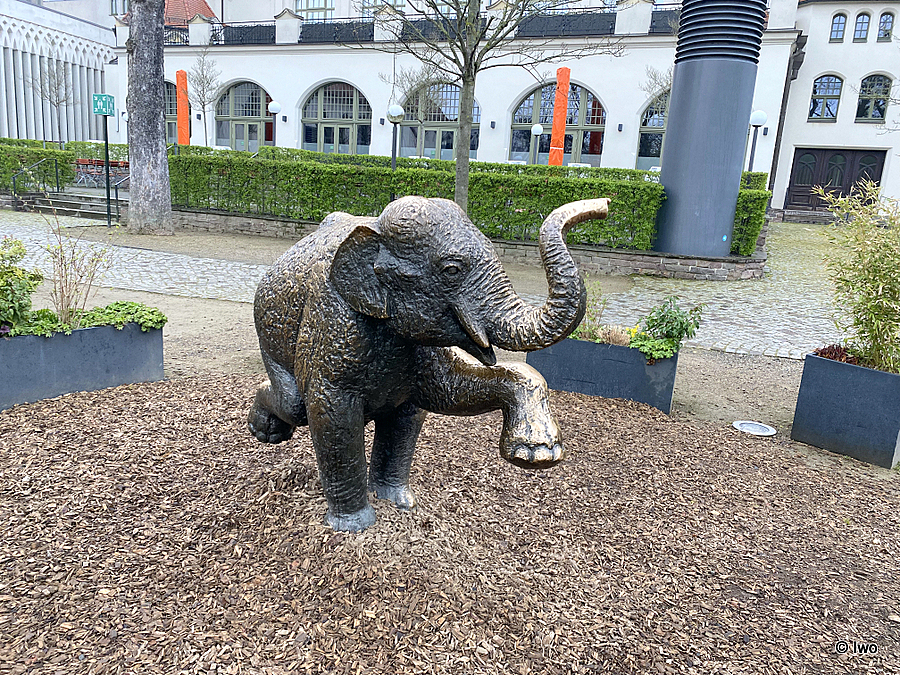 Na prostranství za vstupem do ZOO Leipzig před budovou Kongresshalle stojí socha slůněte, v mapách označená jako Junger Elefant.