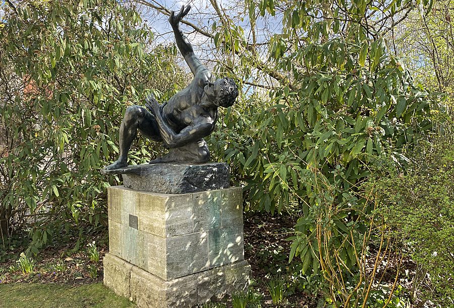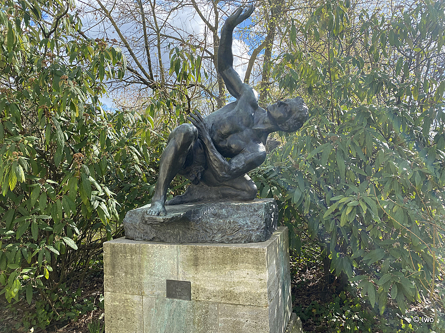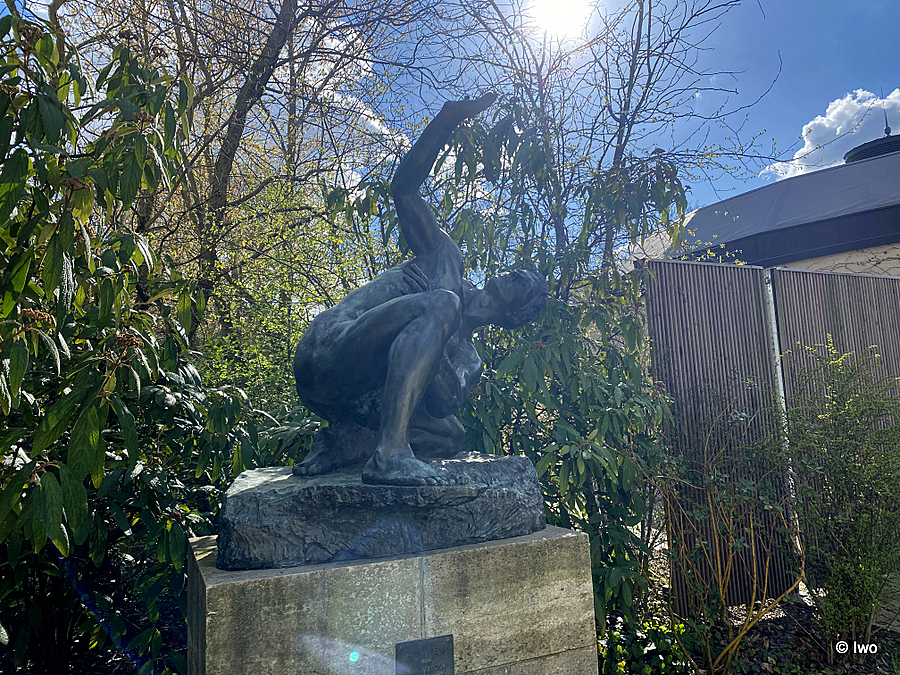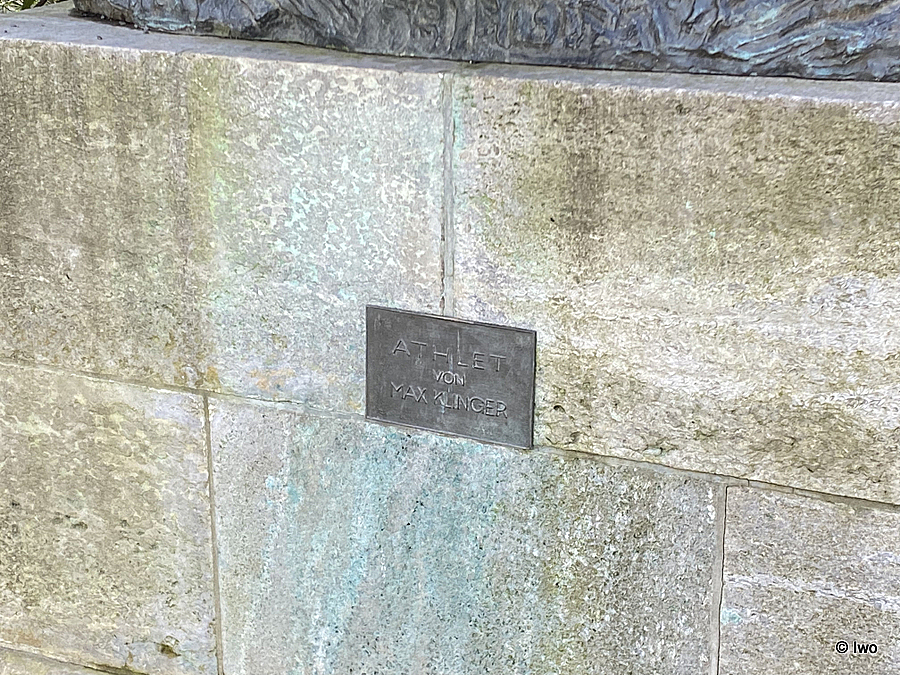 Na mohutném stupňovitém soklu z kamenných bloků (pískovec, travertin, či kdo ví?) je umístěna socha od Maxe Klingera. Po pravdě nevím, o jakou atletickou disciplínu se má jednat a docela chápu, že jsem na ni na netu narazil i pod označením „Ach ne!“.