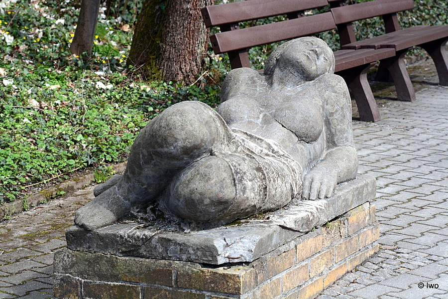 Na křižovatce cest u laviček poblíž výběhu hyen v Tierpark Chemnitz se nachází socha Ležící žena.