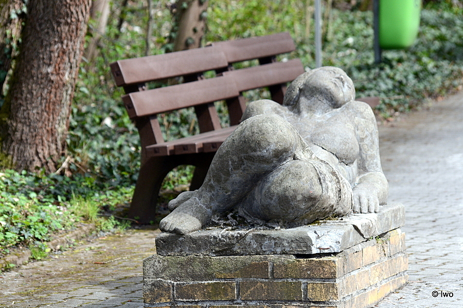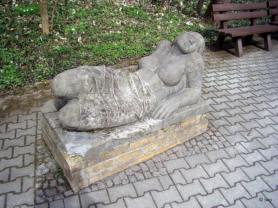 Na křižovatce cest u laviček poblíž výběhu hyen v Tierpark Chemnitz se nachází socha Ležící žena.