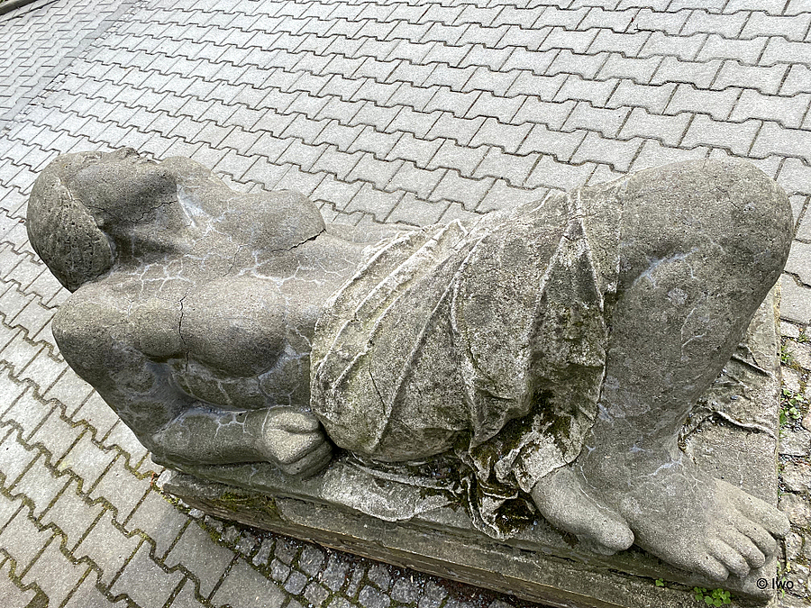 V mírně šikmé ploše dlážděné cesty základna ze tří řad cihel. Na ní silná deska s postavou ležící ženy. Nahá postava má přes nohy od pasu dolů do cca půli stehen přehozenu jakousi látku, nohy šikmo skrčené. Tělo přizvednuté, žena se opírá o lokty, hlava je zakloněná. Nikde žádný popisek, na netu se nedá najít nic. Socha je v bídném stavu, deska pod figurou má jeden roh ulomený a vykukuje z něho kovová armatura. Socha je nejspíš odlitá z betonu, nebo nějakého umělého kamene. Víc než silně popukaná a popraskaná.