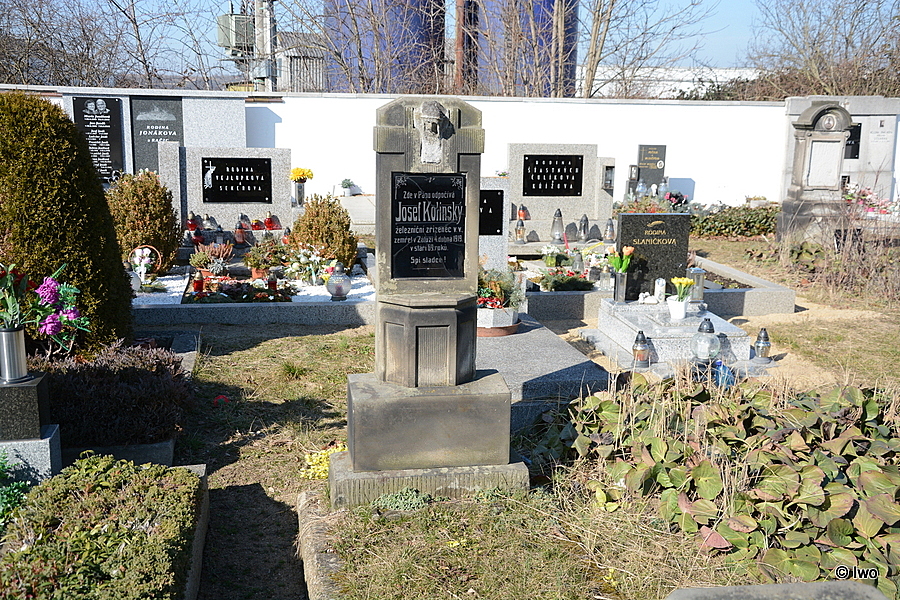 Vpravo od středové cesty v severovýchodní části hřbitova v Račicích se nachází hrob Josefa Kolínského.