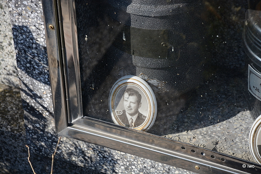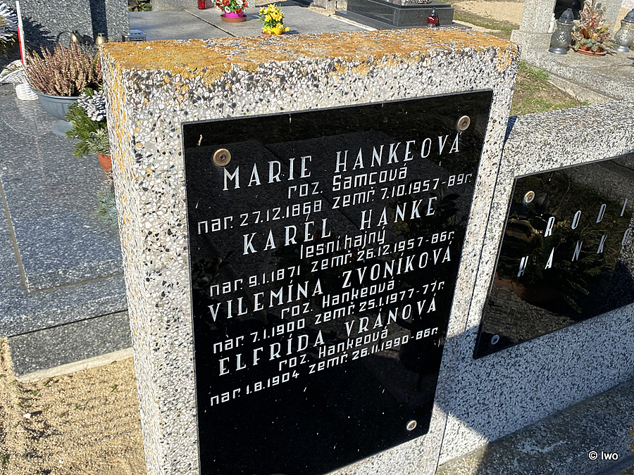 U hrobu jsem zastavil kvůli uniformě portrétu před urnou – podle textu jde ale o pana hajného (byť netuším, jaký jiný než lesní by mohl být). Manželka o tři roky starší, dlouhověká rodina. Vilemína a Elfrída zřejmě dcery poněkud netradičních jmen. Kde leží jejich manželé, kdo ví.