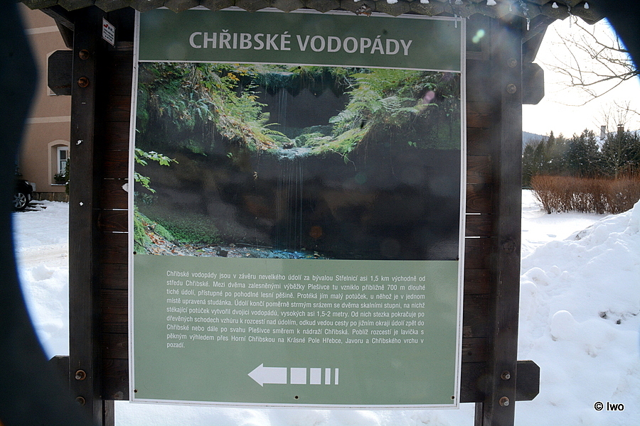 Mým posledním tohodenním cílem byly Chřibské vodopády. Podle popisu na netu se k nim dá dostat několika způsoby, já se ale po předchozích zkušenostech spolehl na navigaci pomocí GPS souřadnic. Autem jsem zastavil kousek za křižovatkou u bývalé sklárny, za křížkem, kde je naproti č.p. 46 v louce místa dost.