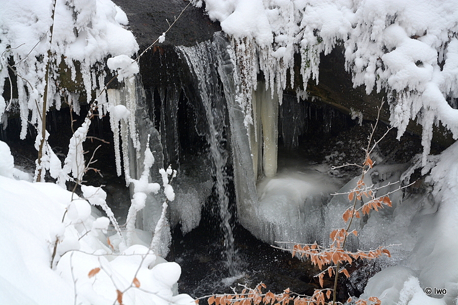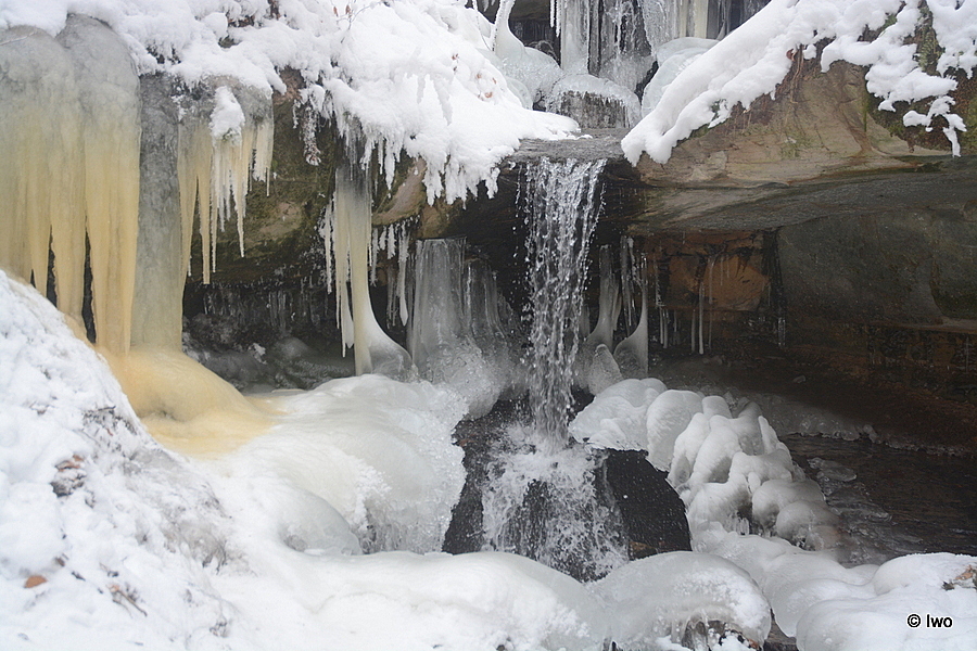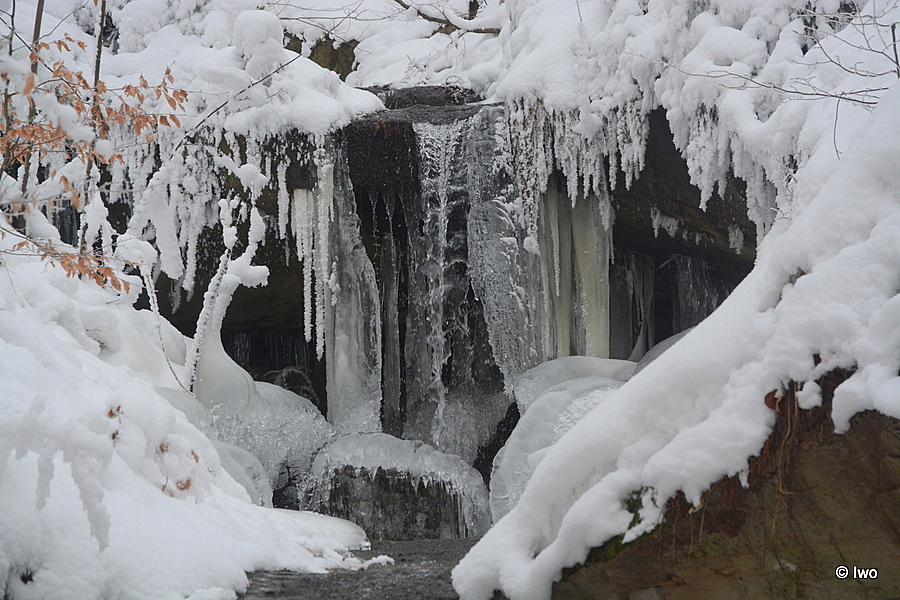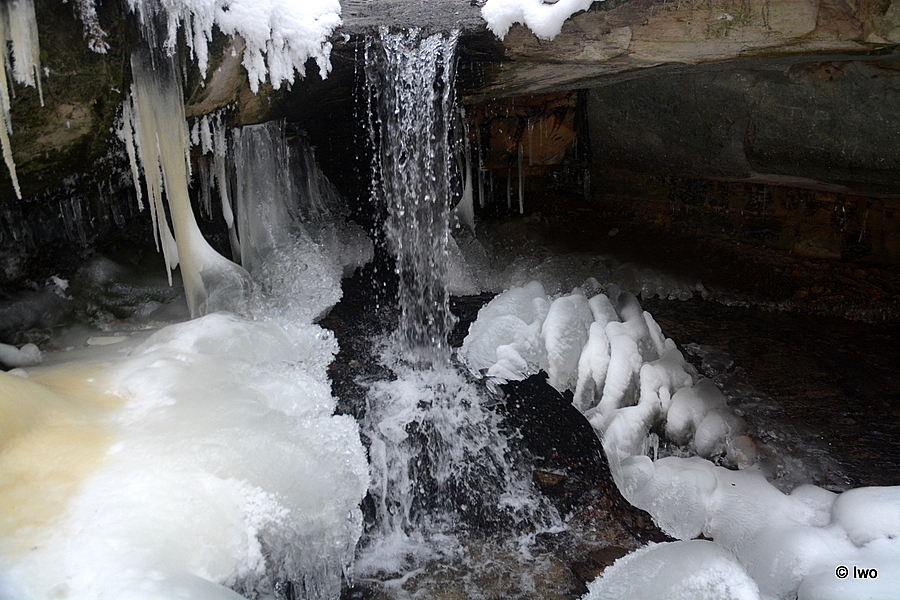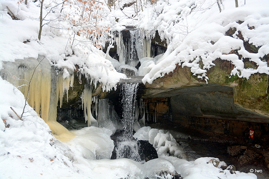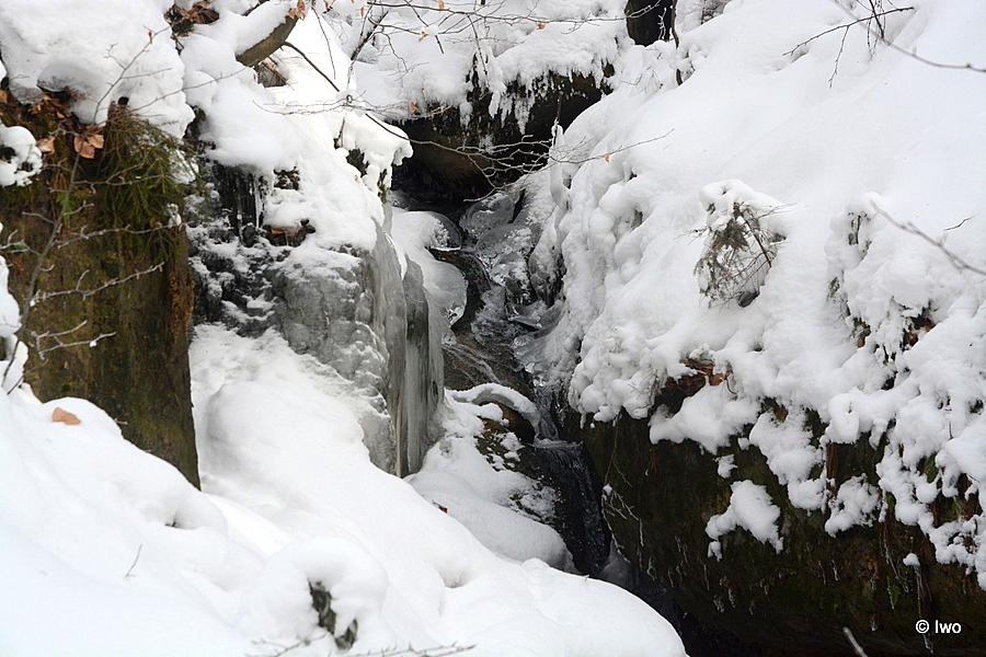 Sbíhám dolů a podél vody postupuji proti proudu, kde jsou hned dva vodopády nad sebou. Voda zurčí přes dvě pískovcové lavice – jen ten trpaslík, který je na fotkách na netu, jaksi absentuje. Jdu podle vodopádů po schodech vzhůru, ohlížím se do údolí, pak koukám před sebe, že i přítok k nim vypadá zajímavě.