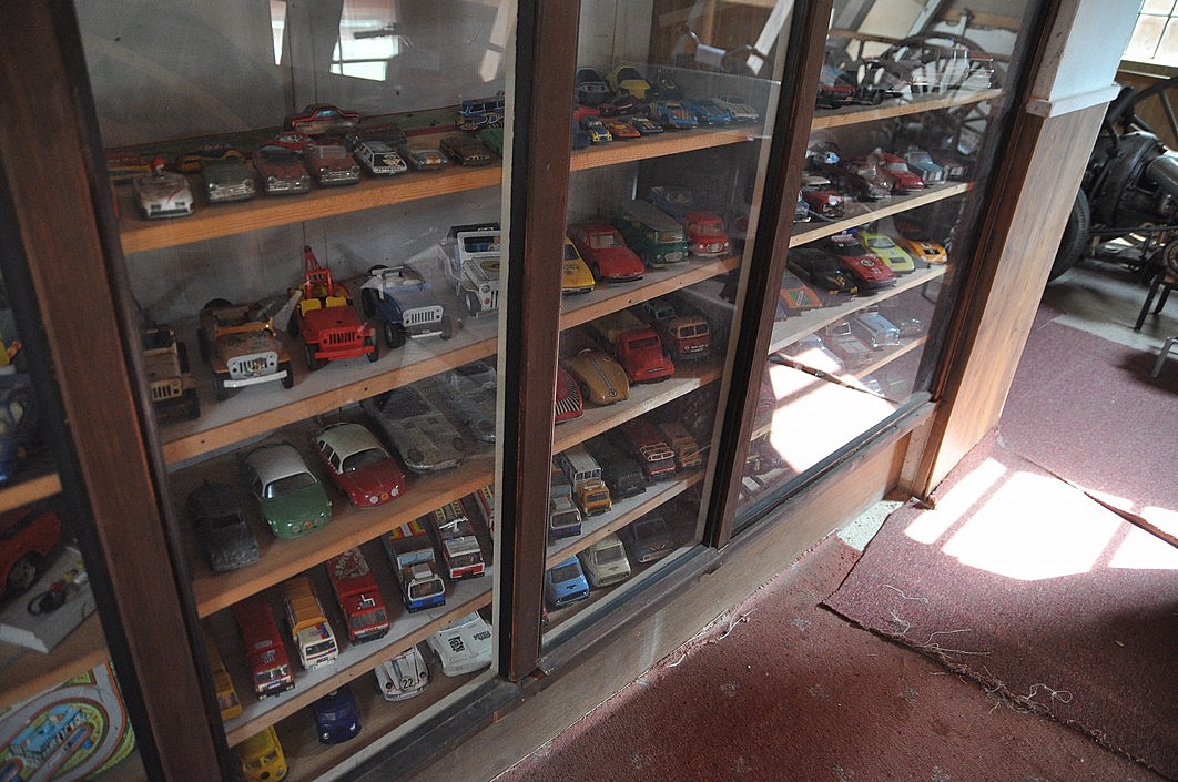 Kdo se spolehne na směrové tabule, zdůrazňující jen ta vozidla, je pak trochu v šoku. První prohlídková místnost je přeplněna psacími a šicími stroji, budíky, fotoaparáty, keramikou, najdou se tu i sáňky či lyže nebo kočárky. Po průchodu tímto přístavkem už jsou k vidění auta a kočáry, prokládané spoustou modelů a hraček. Některé kusy si ještě na silnici pamatuji, většinu ale tak maximálně z filmů pro pamětníky. Otázka, jak se tohle všechno sakra dostalo do patra se vysvětluje, když objevím obří nákladní výtah. Ovšem potřebná škatulata, když má jít nějaký exponát ven, ta si představit nedovedu. A přitom se tu odehrávají poměrně často – spousta exponátů je totiž vyhledávána filmaři, stejně tak domácími jako zahraničními.