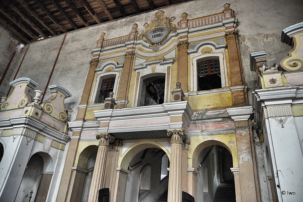 V boční stěně lodi proti vstupu široké trojdílní barokní schodiště. Ve stěně provedena iluzivní barokní fasáda s plastickými postavami v bočních patrových oknech a s figurální skupinou Ecce homo na balkónu. V boční stěně u Svatých schodů výklenek upravený jako žalář s vězněm z roku 1733.