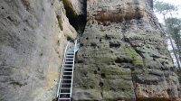 Návrat zpět a po modré dál k Hadímu prameni. Voda pitná a dobrá. Další kus cesty a Vlčí deska. Kousek od ní rozcestí, zelená odbočuje svahem dolů ke Křinici a přes ni na německou stranu, kde hned končí. A tady pozor – žlutá, červená, ale nikoli přes Niedermühle dál, nýbrž hned doleva. Červená míří k soutěskám Obere Schleuse, žlutá ale daleko dříve odbočuje do kopce. Po chvíli lopocení je tu vyhlídka Taubenstein. Spíš takový příjemně uklidňující kout, než něco, co by člověku vyrazilo dech. Odtud už poslední úsek oficiální cesty do Hinterhermsdorfu. Pro mne ovšem cesta nekončí – pokračuji po žluté dál kolem rozhledny Weifberg. Samotné rozhledně se vyhnu, obejdu kopec po neznačené, abych se na druhé straně na žlutou opět napojil a dostal se přes hranice, do Mikulášovic. No, a pokud to bylo dneska dlouhé a únavné, pak celou dobu bez problémů – až právě na překročení hranice. Tady řádili dřevaři a v haluzích, poházených přes cestu, se mi zamotaly nohy tak, že jsem se vyválel v blátě. Do autobusu mne naštěstí vzali…