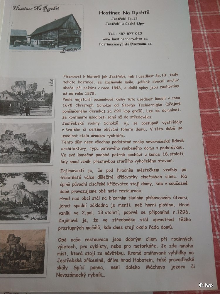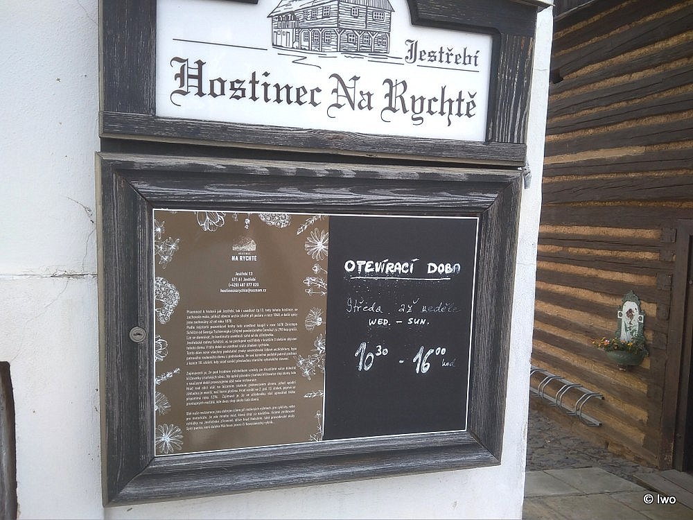 Volba padla právě na tuhle nepřehlédnutelnou a nemalou podstávku u křižovatky pod hradem. Parkovat se dá v ulici mezi touhle a vedlejší hospodou (Pod Habsteinem), místa docela dost. Jíst a pít se dá buď venku, pod přístřeškem, který je od silnice šikovně oddělen hranicí dřeva, nebo uvnitř. K dispozici jsou dvě části – dřevěná, bývalá obytná světnice (u níž je i dětský koutek), a zděná, bývalé hospodářské prostory (chlévy).