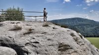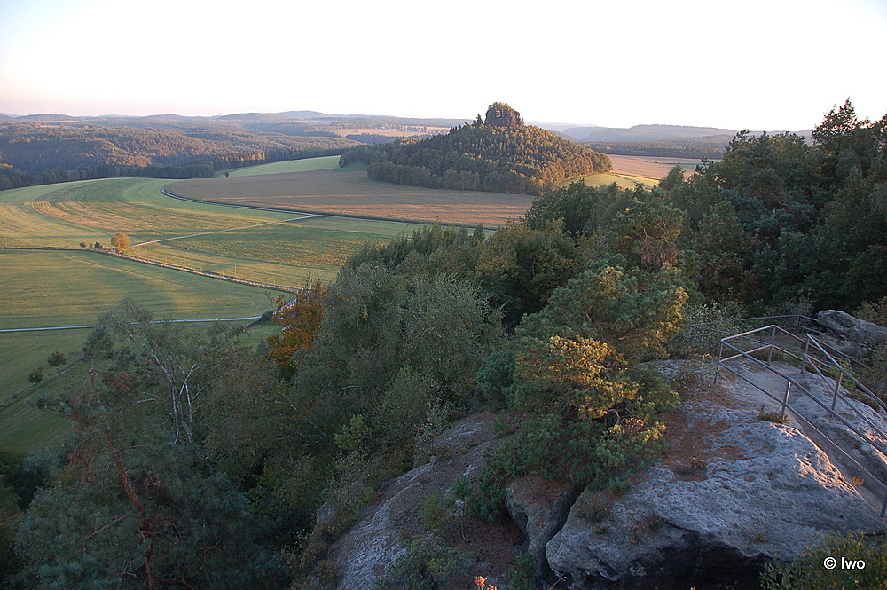 Ale popořadě – ze stanice Schöna z údolí Labe je třeba trochu si zafunět, je to docela do kopce. Tehdy jsem psal „neznačenou dlážděnou silničkou“, dnes tu částečně vede žlutá značka. Jen co se vyloupnete z lesa na rovinu a do polí, máte na výběr. Buď až do obce a na Zirkelstein po žluté, nebo to střihnout přes pole pěšinami rovnou za nosem. Ať tak nebo tak, čeká pár schodů a žebříků a plošina s nádherným kruhovým výhledem. Přehlédnout samozřejmě nelze druhý dnešní cíl – Císařskou korunu. Je třeba vyrazit po žluté do obce Schöna, správně se trefit a po červené dojít k odbočce na její vyhlídky. Těch je tu hned několik, a stojí za to si nenechat žádnou ujít. A kdo bude pozorný, uvidí i lva.