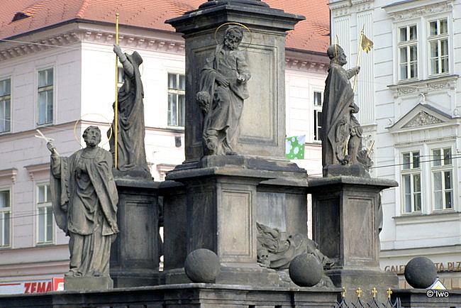 Zřejmě jedinou (a tudíž poslední) oblastí, kterou autoři monumentálního encyklopedického díla o mariánských, trojičních a dalších světeckých sloupech a pilířích dosud nezmapovali, je Plzeňsko. Tudíž nezbývá, než se spolehnout na internetové zdroje, které ale nejsou zdaleka tak obsáhlé. A kde jinde začít, než přímo v samotné metropoli. Renesanční mariánský sloup v Plzni stojí na náměstí Republiky „ve stínu“ katedrály svatého Bartoloměje, která se chlubí nejvyšší kostelní věží na území republiky a z níž jsem se rozhlížel v loňském roce, mezi katedrálou a radnicí.