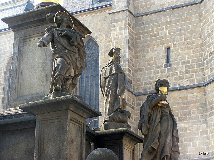 Z doby vzniku sloupu jsou sochy sv. Václava, Bartoloměje, Rocha, Floriána a ležící socha sv. Rosálie. Po dalším moru přidány r. 1714 sochy sv. Františka Xaverského, Petra z Alcantary a Barbory, rovněž díla Kristiána Widmana.