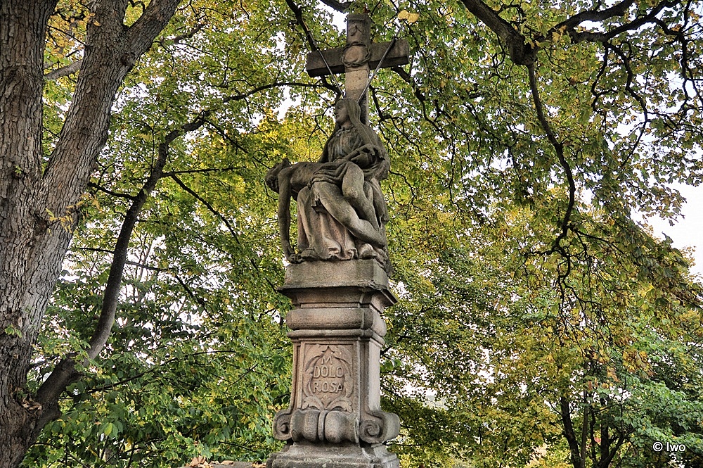 Na desce je osazen na nízkém soklíku umístěný hranolový podstavec, členěný 4 bočními, z volut vyrůstajícími pilastry, ukončenými vydutými prstenci a římsou; na ní je vztyčen kamenný kříž s krátkými rameny a na křížení s reliéfem trnové koruny. Na soklu v oválné kartuši, tvořené akantovými listy, nápis: “M / DOLO / ROSA”.