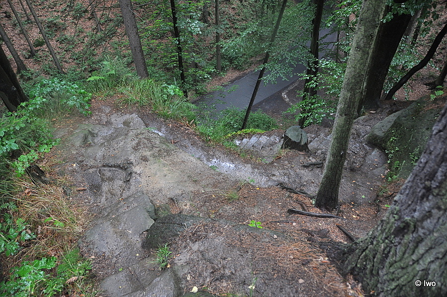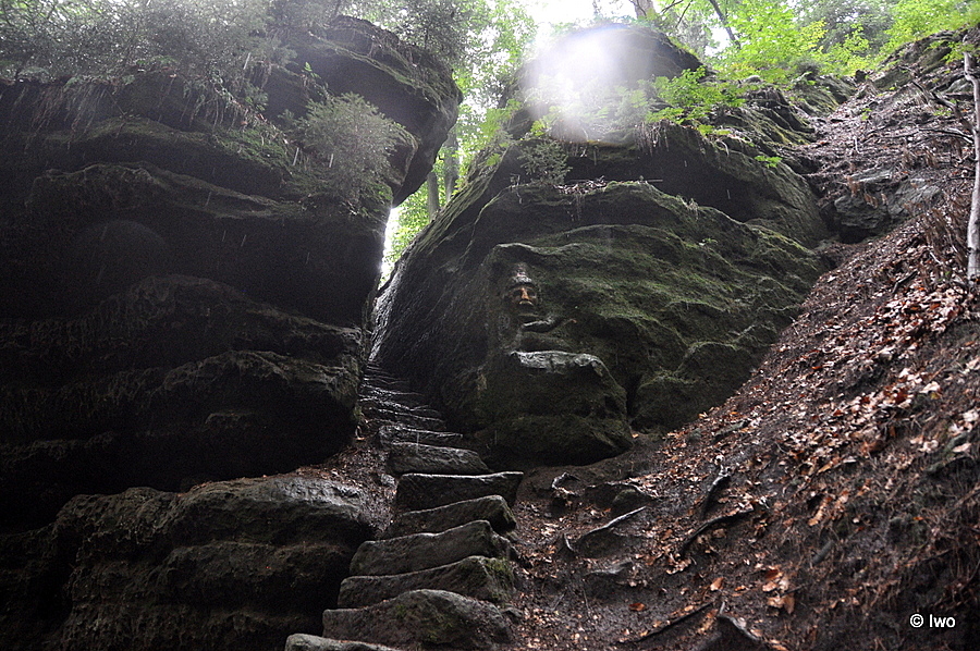 Jedná se o skálu, v níž cestu plnou schůdků a postavy skřítků, kteří pomohli chudé bezdomovkyni Rietschelové, vytesali otec a syn Vaterovi (na hřbitově v Jetřichovicích se toto příjmení vyskytuje víc než často a na infotabuli najdete popis, kde najít konkrétní náhrobek).