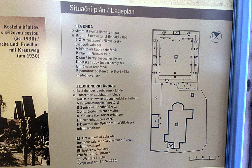 V tuto chvíli je důležité, že v obci stál kostel, u něho hřbitov a na hřbitově byla křížová cesta. Zmizela v nenávratnu, stejně jako více než 130 zdejších domů, včetně školy i kostela.