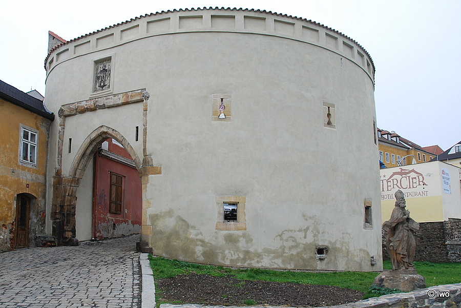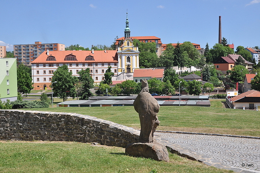 Před gotickým barbakánem v Kadani stojí na travnaté ploše socha sv. Vojtěcha.