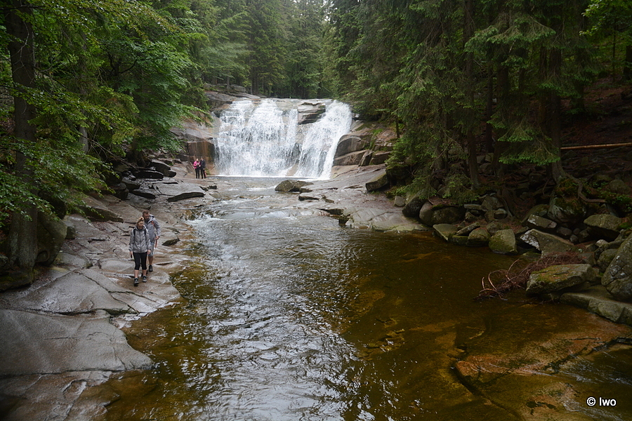 Pokud mne paměť neklame, úplně první vodopády, u nichž jsem nebyl sám. Masová atrakce i v tom nejhnusnějším počasí. Až takřka na místo pohodlná asfaltka od Harrachova (modrá značka), či alternativně po žluté (Harrachov – Rýžoviště). Přes říčku vyhlídkový mostek. Pod ním viditelné vyšší kaskády, ale také zábradlí, přes které se mi před tolika lidmi nechtělo.