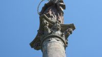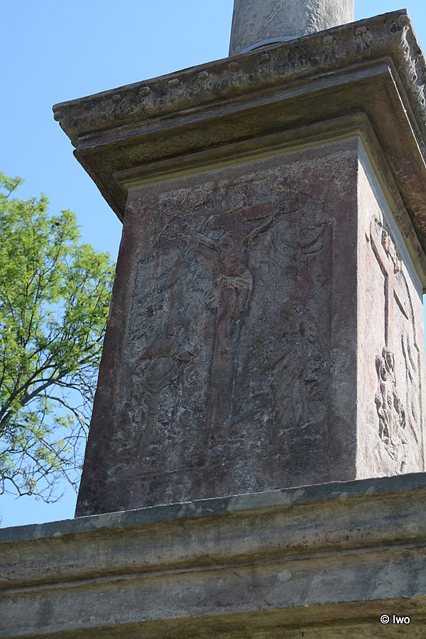 PS neodborně a laicky: O původu nikde nic, označit ho za morový lze zřejmě jen s velkou dávkou fantazie. Obdobnou architekturu sloupu jsem, pamatuji-li se dobře, dosud neviděl. Proč jsou ve střední části sloupky s prostorem uvnitř, zůstává mi záhadou. Stejně jako vzhled andílků – ani s největší dávkou představivosti se mi nezdá, že by jejich autorem mohl být jeden a ten samý sochař. Stačí se podívat na detailní portréty – ať už provedení očí, či celkový výraz. Tři reliéfy na soklu jsou jasné. Ovšem ten zadní – jak mohli autoři evidenčního listu ve výjevu vidět Nanebevstoupení, to nevím. A docela mám pochyby i o sv. Kryštofovi, protože mu chybí přenášené dítě a hůl se nezelená, nýbrž je zakončena malým křížem (což je podle netových zdrojů atribut sv. Jana Křtitele). Inu, vyberte si…