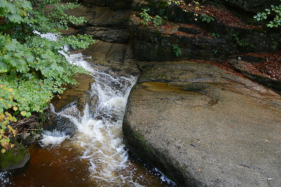 Říčka spoutaná a přitom divoká. Celé koryto je svázáno regulací a okolními zdmi, podél toku se nachází nespočet nejrůznějších továrních objektů, v těsném sousedství vede silnice z Liberce do Rudolfova (některé stěny dosahují opravdu úctyhodných výšek!). Voda se tu valí přes spoustu ploten, peřejí a kaskád, obzvláště po nedávném dešti to tu pění a klokotá. Takže přesně určit v té spoustě míst, byť s navigací v ruce, které konkrétní si vysloužilo označení regulérního vodopádu, není úplně jednoduché. Je jich tu zajímavých víc než dost. Navíc oficiální fotky jsou foceny jak na webu o vodopádech, tak na mapy.cz, přímo z koryta, což já jsem si za současného stavu vody mezi kluzkými kameny netroufl.