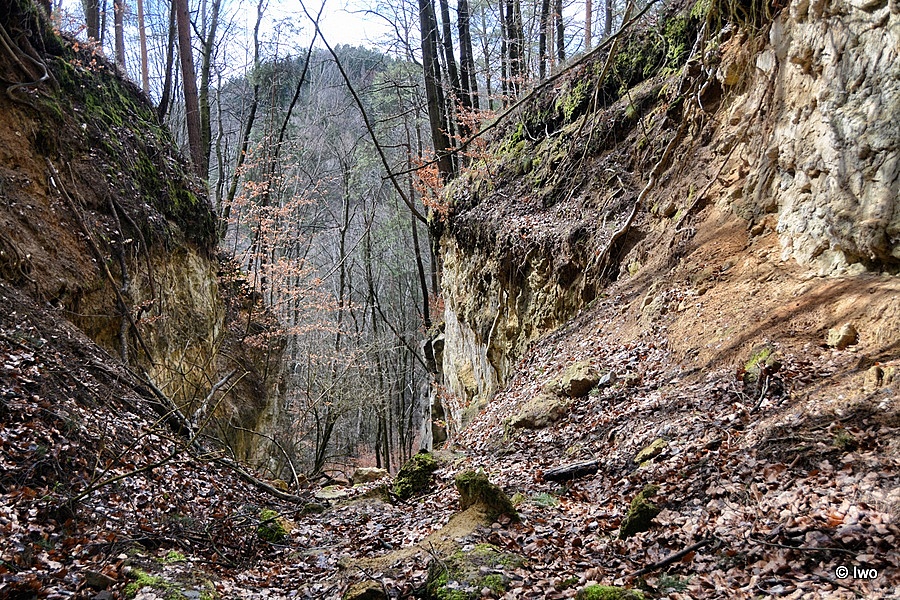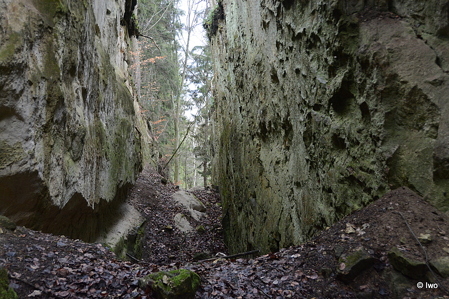 Několik desítek metrů dlouhý úzký kaňon ve vápnitých pískovcích s až 20 m vysokými stěnami začíná na vrcholu kopce a sestupuje jihozápadním směrem k silnici Smržov – Český Dub. Na několika místech ponecháno několik sloupků čediče jako “rozpěry”, které nyní vytváří skalní mosty. Stěny tvořeny výraznými svislými vrstvami, které se místy odlupují a padají. Geologická pozoruhodnost, velice romantické místo.