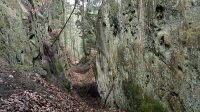 Z toho totiž vyplývá, že je vhodné se neomezit jen na to jedno jediné místo, ale stojí za námahu se porozhlédnout i kousek dál. Vcelku nedaleko jsou totiž mimo značené cesty pozůstatky zmíněné Malé Čertovy zdi. V lesích za Smržovem, mezi Budíkovem a Rovení, jsou na skalním hřbetu pozůstatky těžby – široké prázdné příkopy v pískovci. Cesta k nim se nehledá zrovna snadno, i s navigací v ruce jsem kroužil lesem a nedokázal se rozhodnout, která z pěšin mě dovede na správné místo.